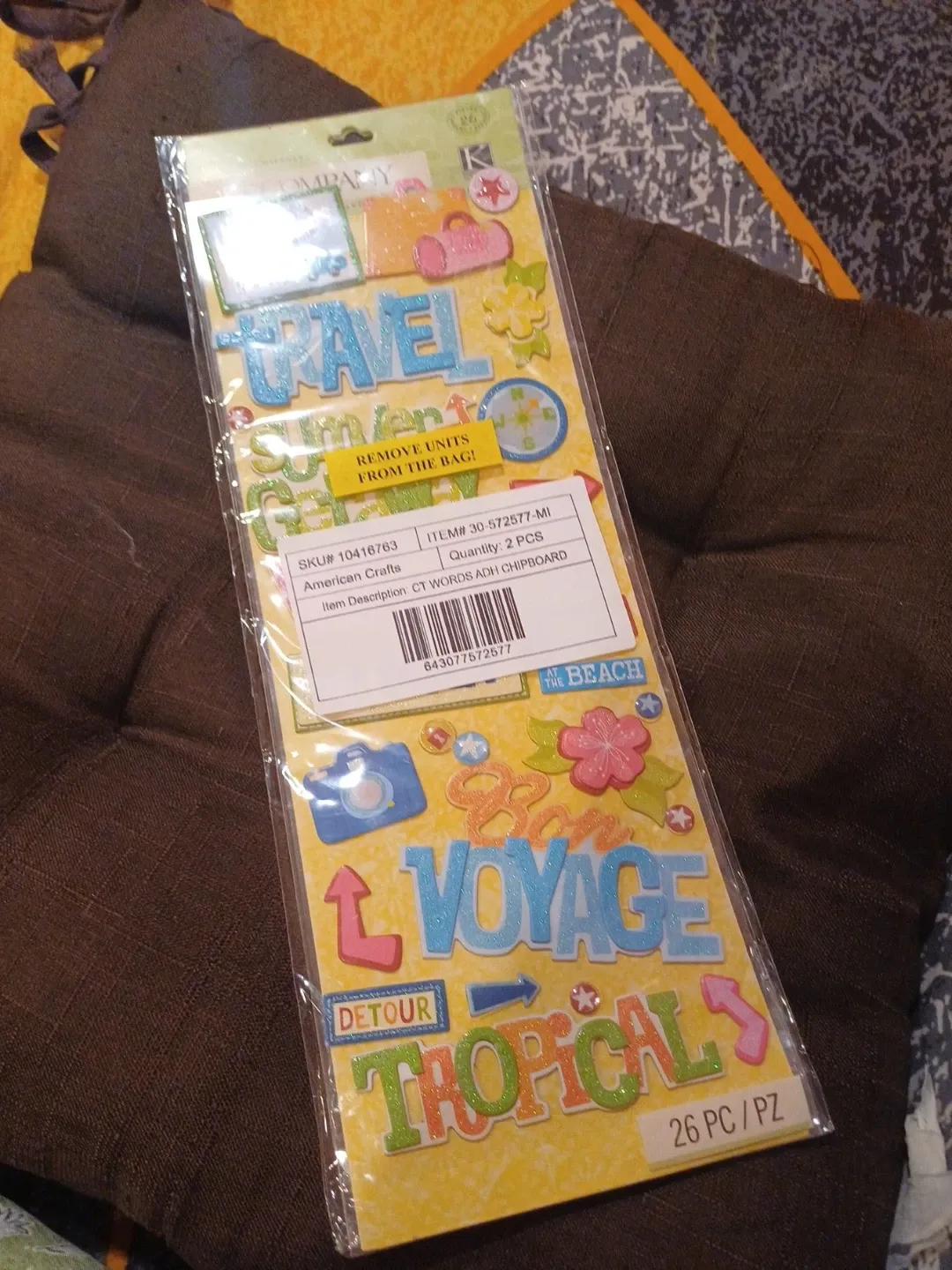 Add some fun flair to your scrapbooking or craft projects with these cute chipboard stickers! The pack includes travel-themed words and icons like 'Voyage', 'Tropical', cameras, and more. There are 26 pieces in total to help you create unique designs