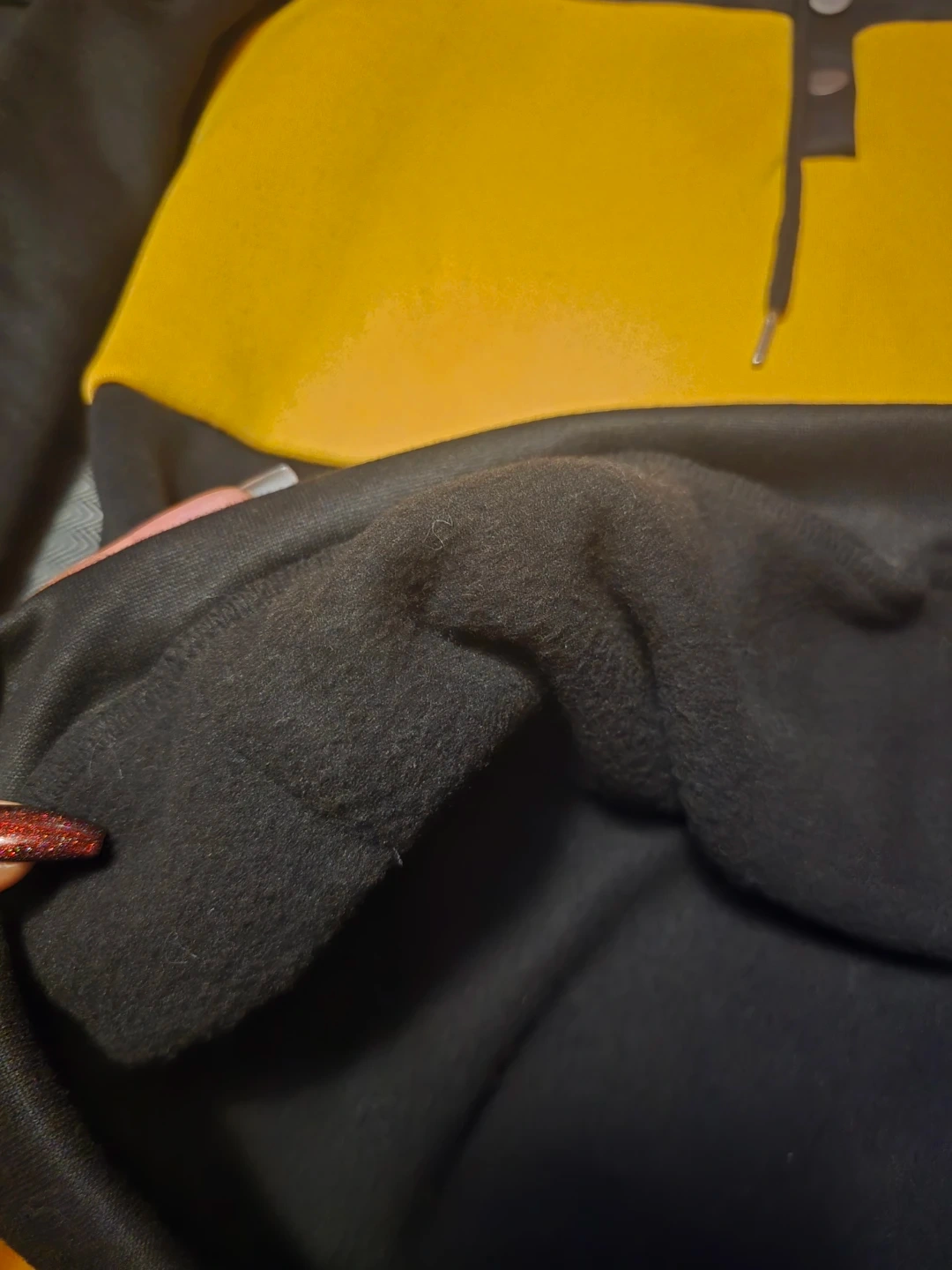 Cozy black hoodie with a yellow color block detail across the chest. It features a kangaroo pocket and a snap-button placket at the neck. Made from a soft, fleece-lined material for extra warmth.