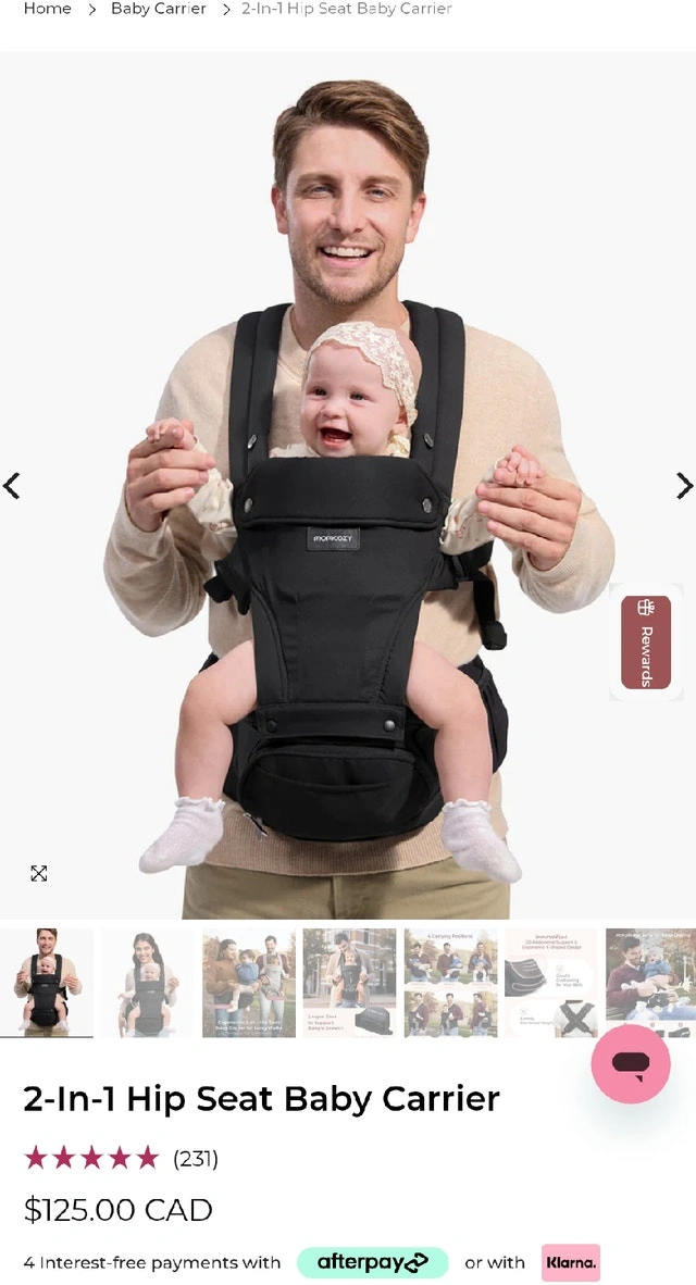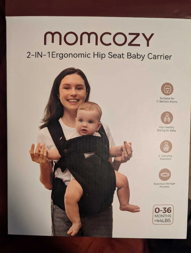 Offering a new Momcozy 2-in-1 ergonomic hip seat baby carrier. Suitable for babies 0-36 months and up to 44lbs. Features multiple carrying positions and spacious storage pockets. Great for C-Section Moms and ensures hip-healthy sitting for baby. Cash and cashless payments accepted.