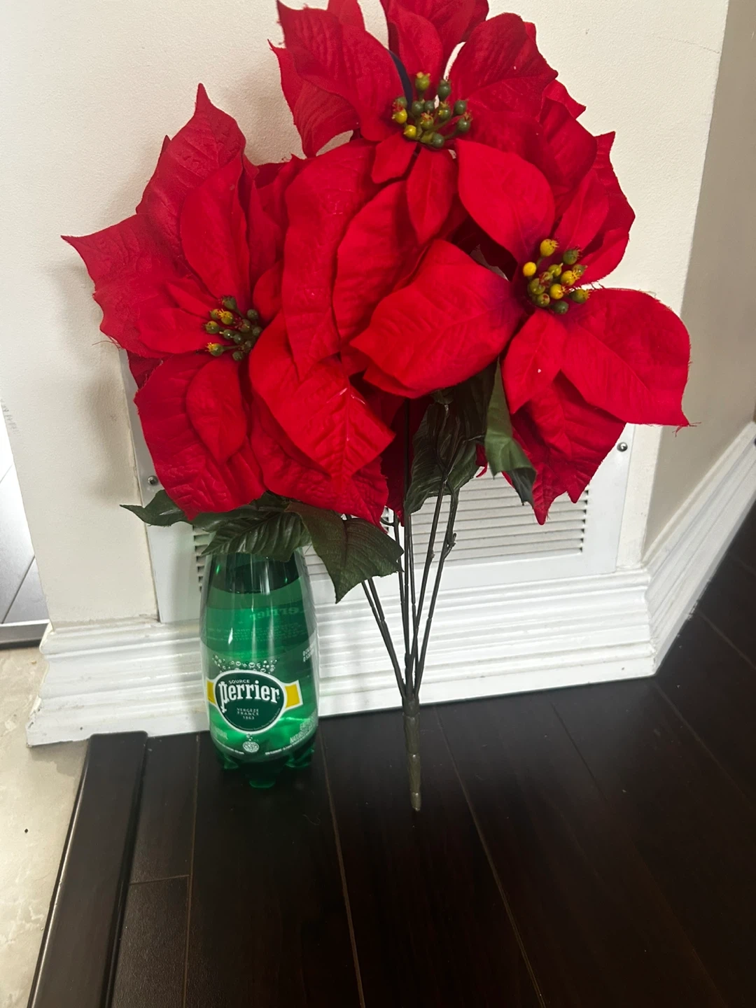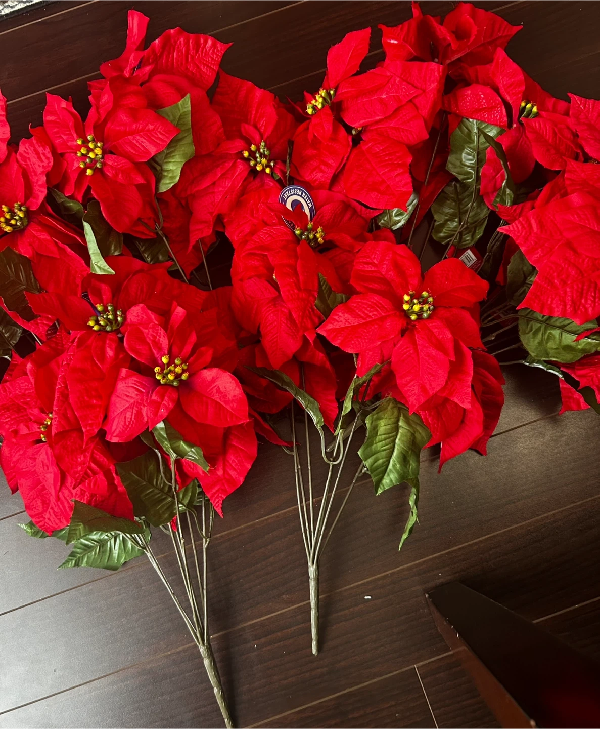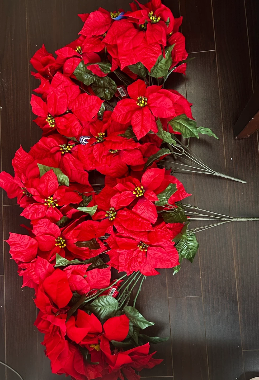 Add some festive cheer with this set of 7 artificial red poinsettia stems. These vibrant flowers are perfect for holiday decorating. Fabric petals and green leaves. Brand new!!