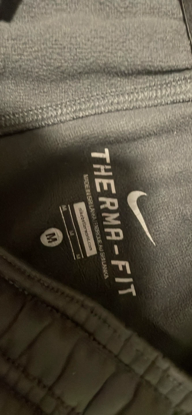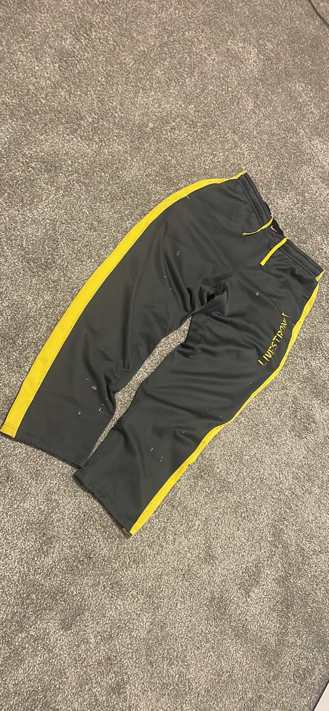 Grey Nike Therma-FIT sweatpants with yellow accents. These pants are a size medium and feature a drawstring waist. They're made for warmth and comfort. paint stained