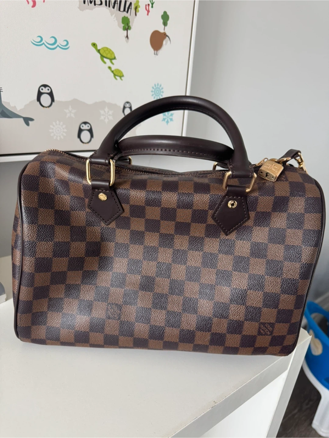 A Louis Vuitton Speedy 25 handbag in the iconic Monogram canvas. It features dual top handles, a zip-top closure, and gold-tone hardware, including a lock and key. Crafted from durable coated canvas with leather trim.