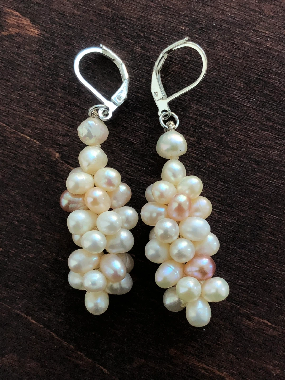 These elegant drop earrings feature a cluster of white and pink pearls. The silver-tone leverback closures ensure they stay securely in place. They're perfect for adding a touch of classic sophistication to any outfit! NEW - Handmade!