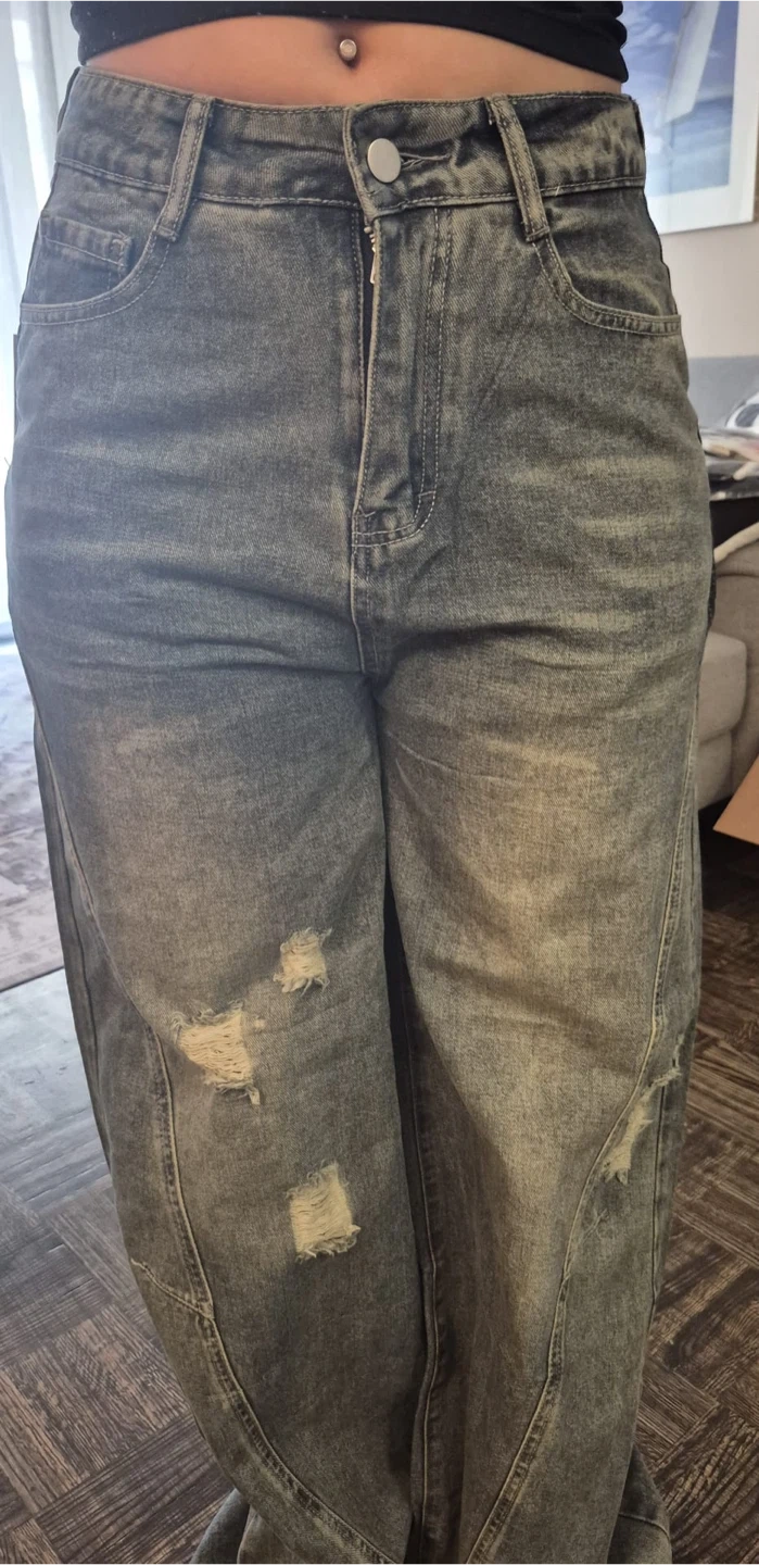CRZY JEANS Ripped Wide Leg Jeans - Grey Wash