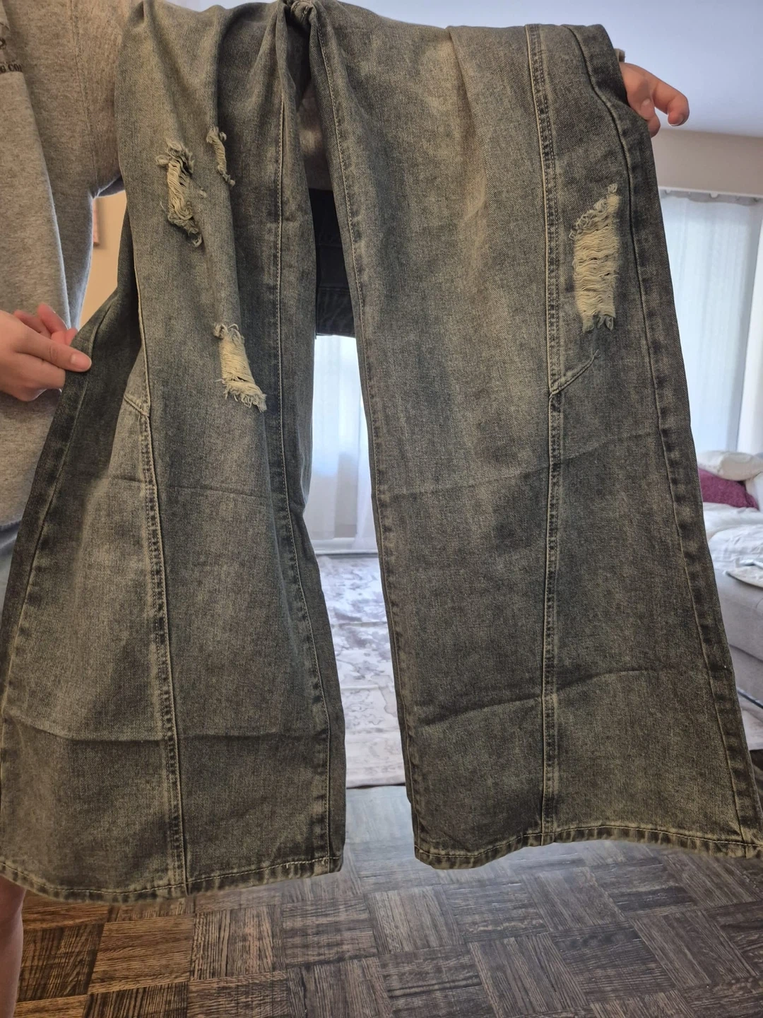 These CRZY JEANS are a grey wash with a ripped, wide leg style. They're made of denim for a classic feel. The distressed details add a modern edge to the look.