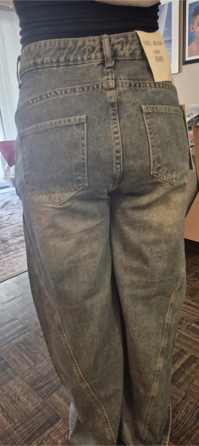 These CRZY JEANS are a grey wash with a ripped, wide leg style. They're made of denim for a classic feel. The distressed details add a modern edge to the look.