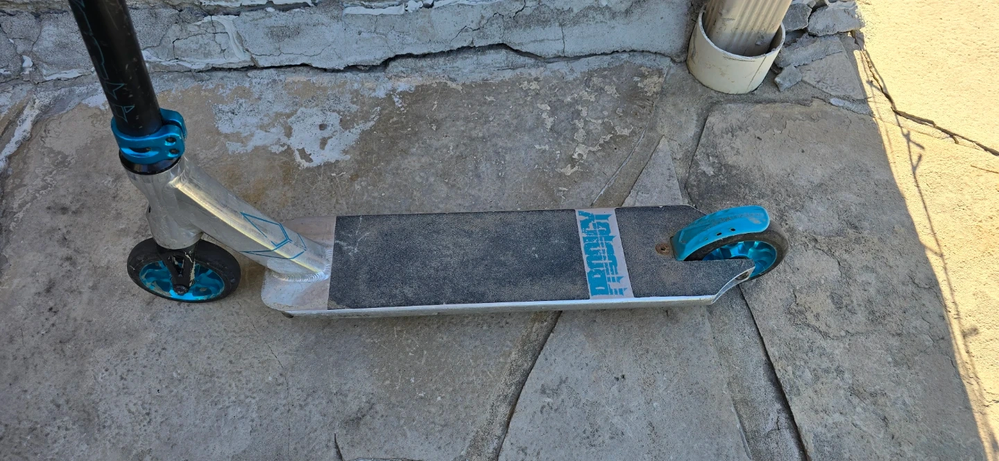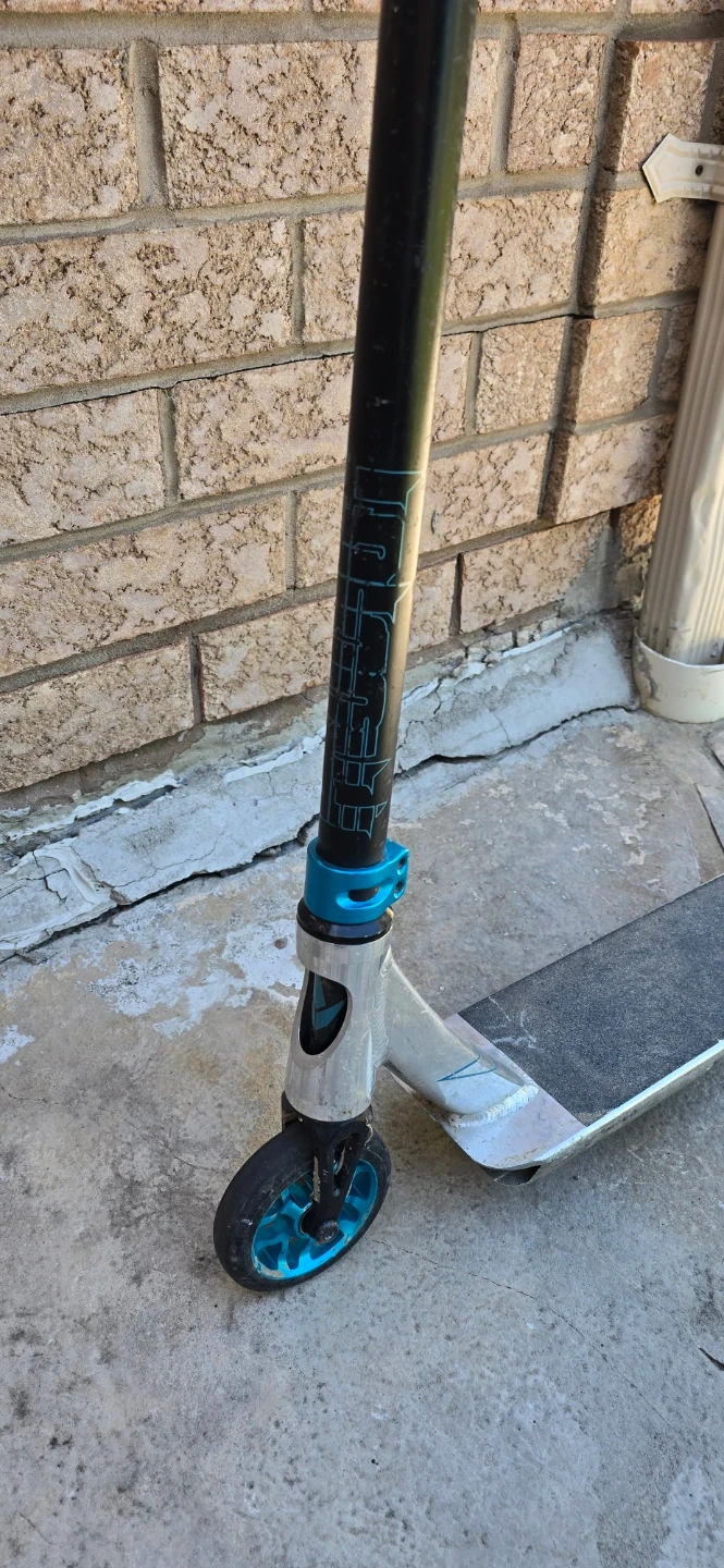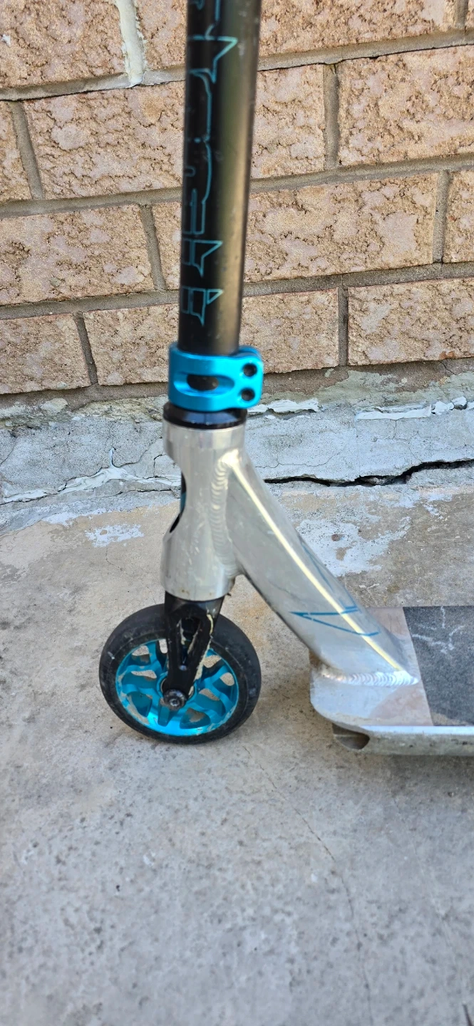 This Fuzion pro scooter has a black handlebar and silver deck with blue accents. The grips are black and the wheels are blue.