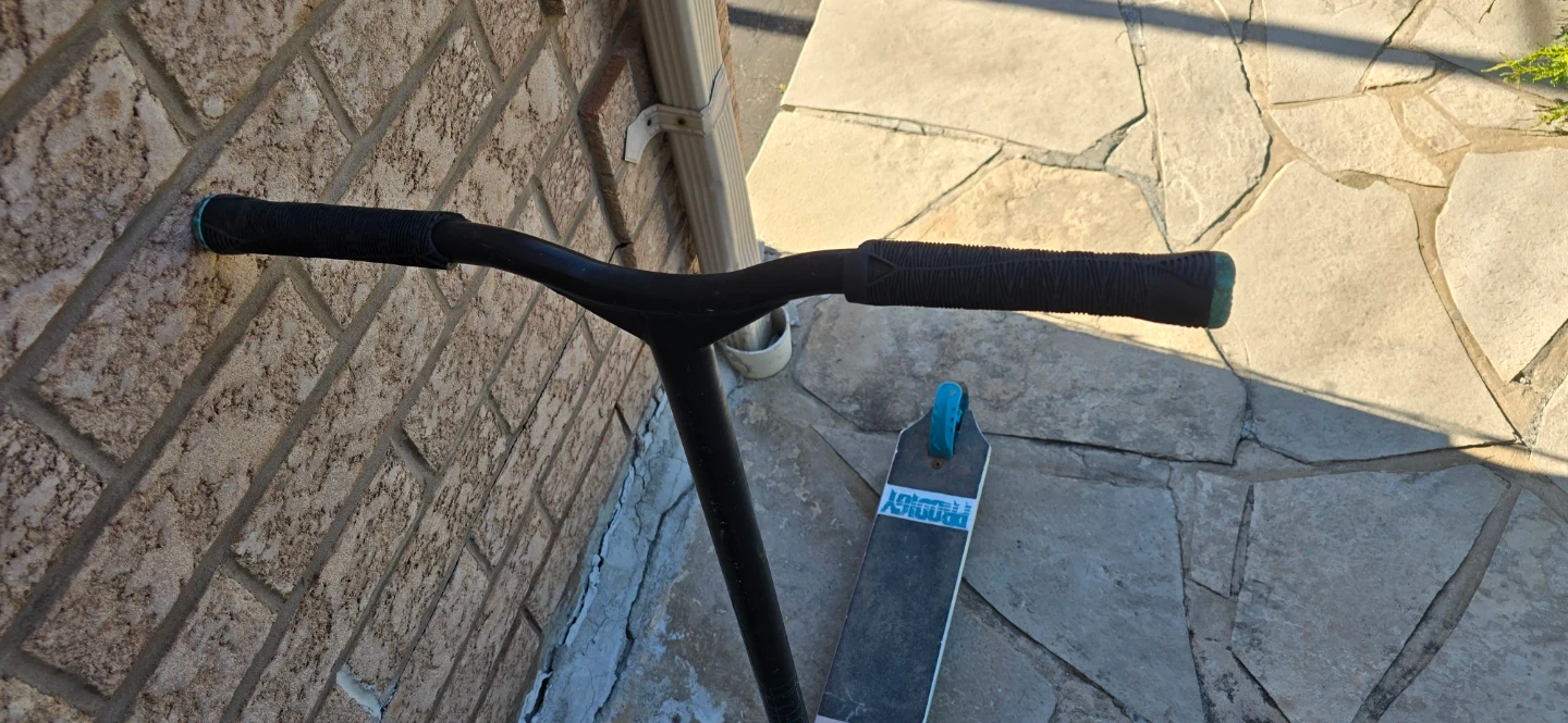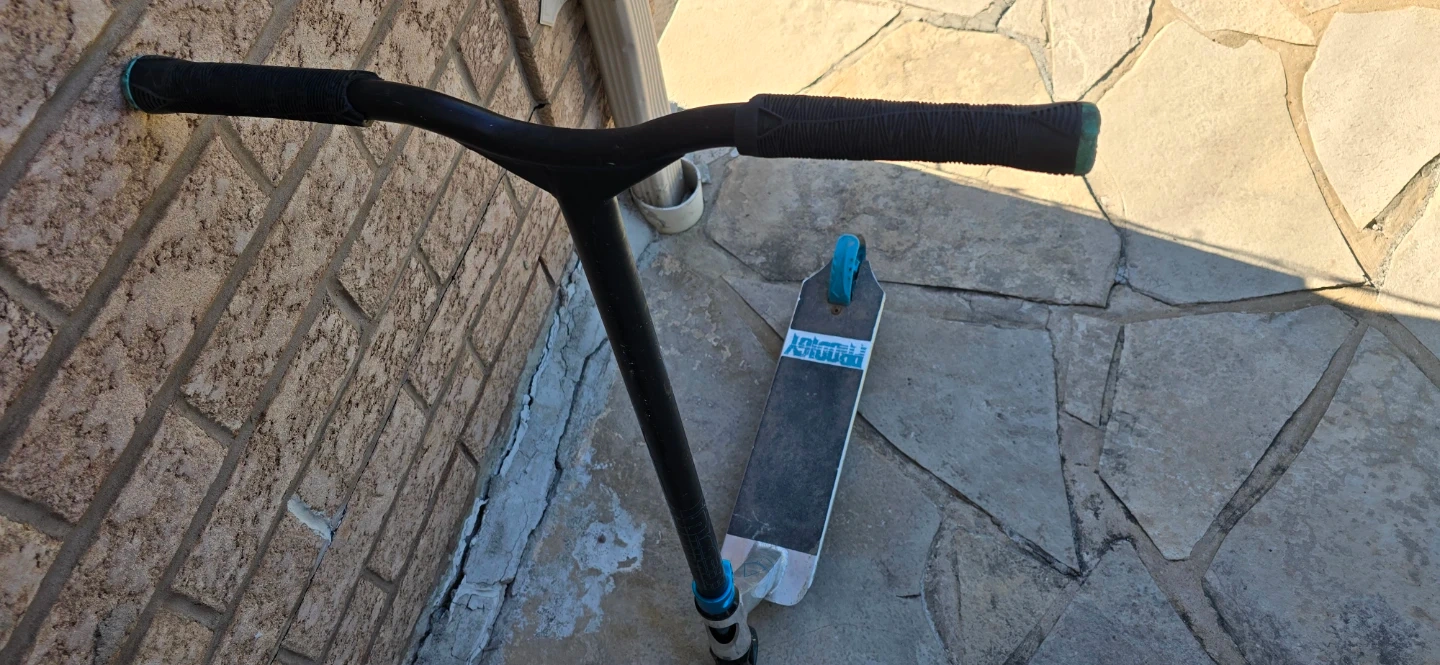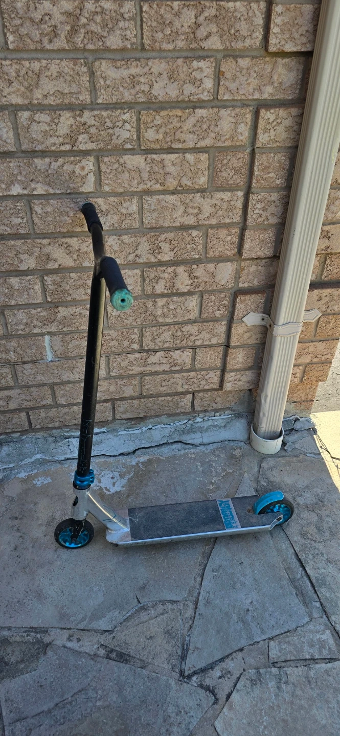 This Fuzion pro scooter has a black handlebar and silver deck with blue accents. The grips are black and the wheels are blue.