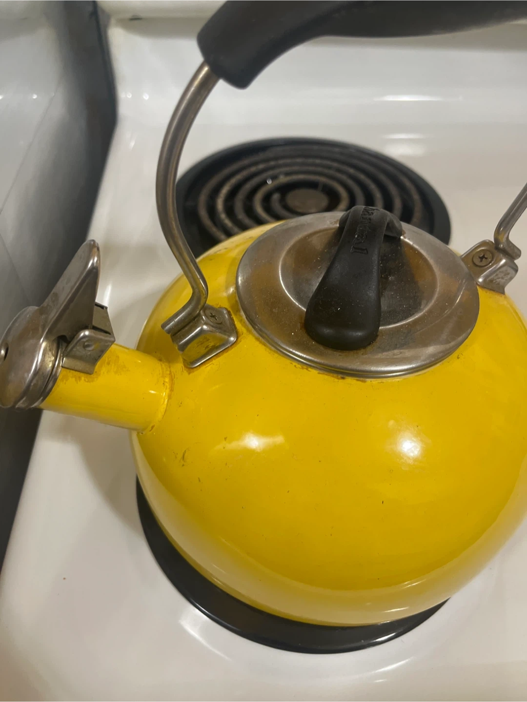 This is a bright yellow tea kettle with a black handle. It's made of metal and has a whistling spout. Great for quickly boiling water on the stovetop!