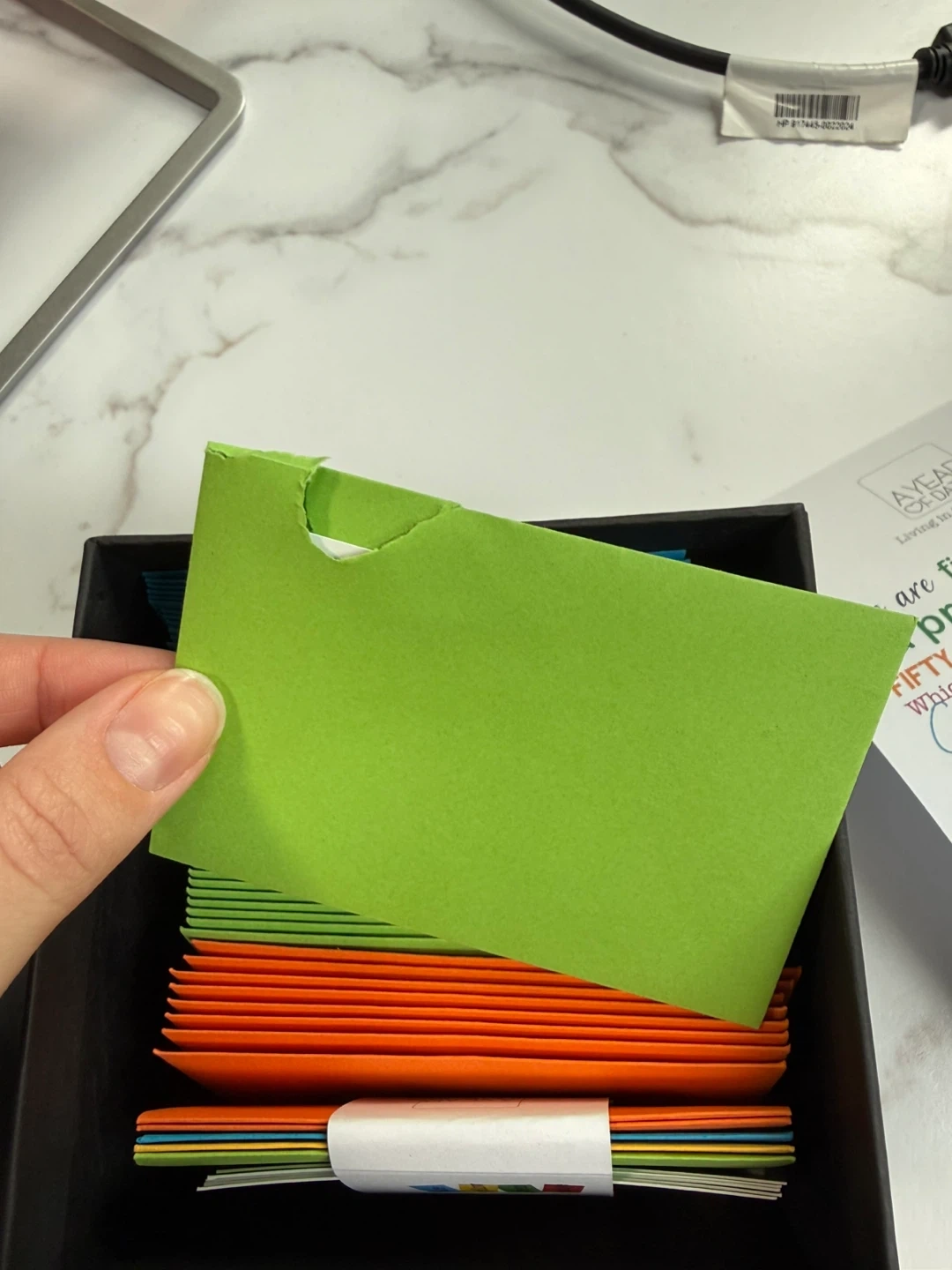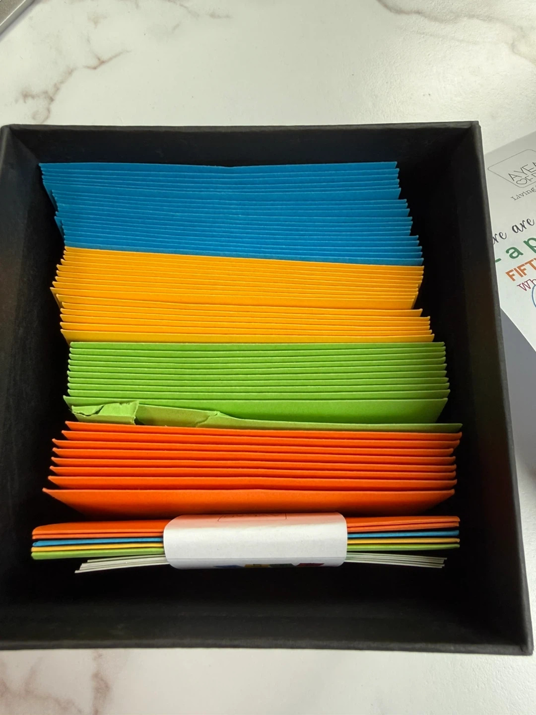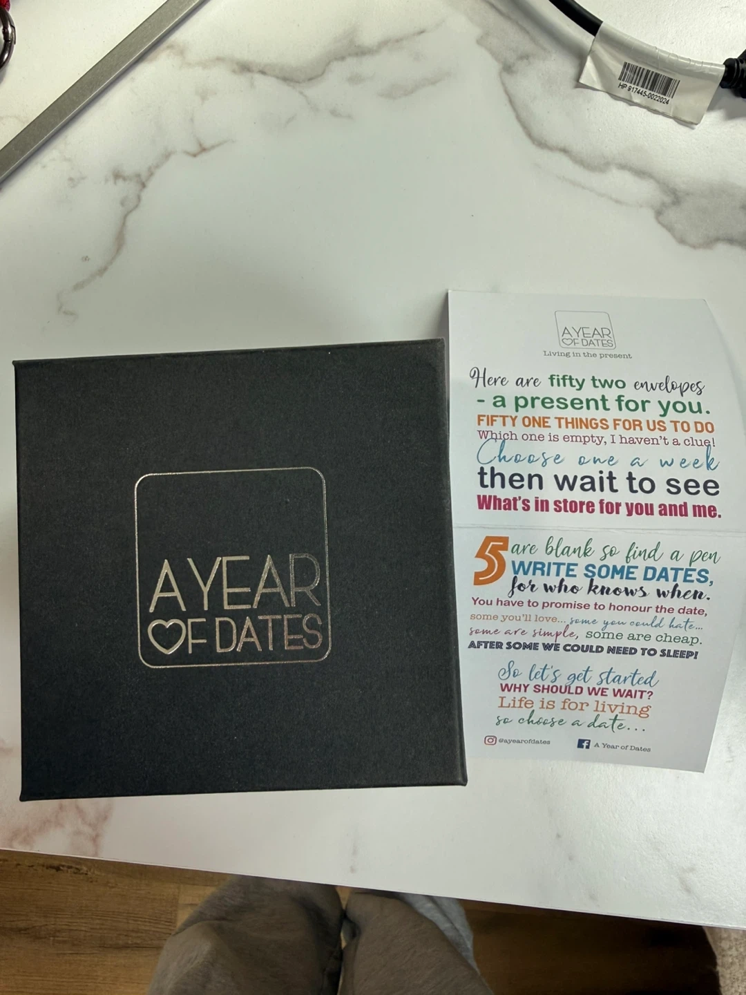 This gift box includes 52 date night ideas for couples, with unique suggestions and 5 blank envelopes for custom dates. It's a fun way to plan new experiences together. Includes original box and instruction card.