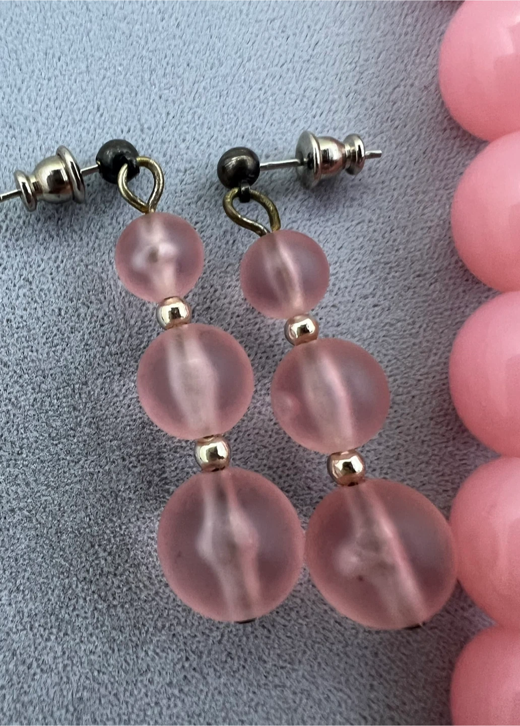 A pink beaded necklace and dangle earrings