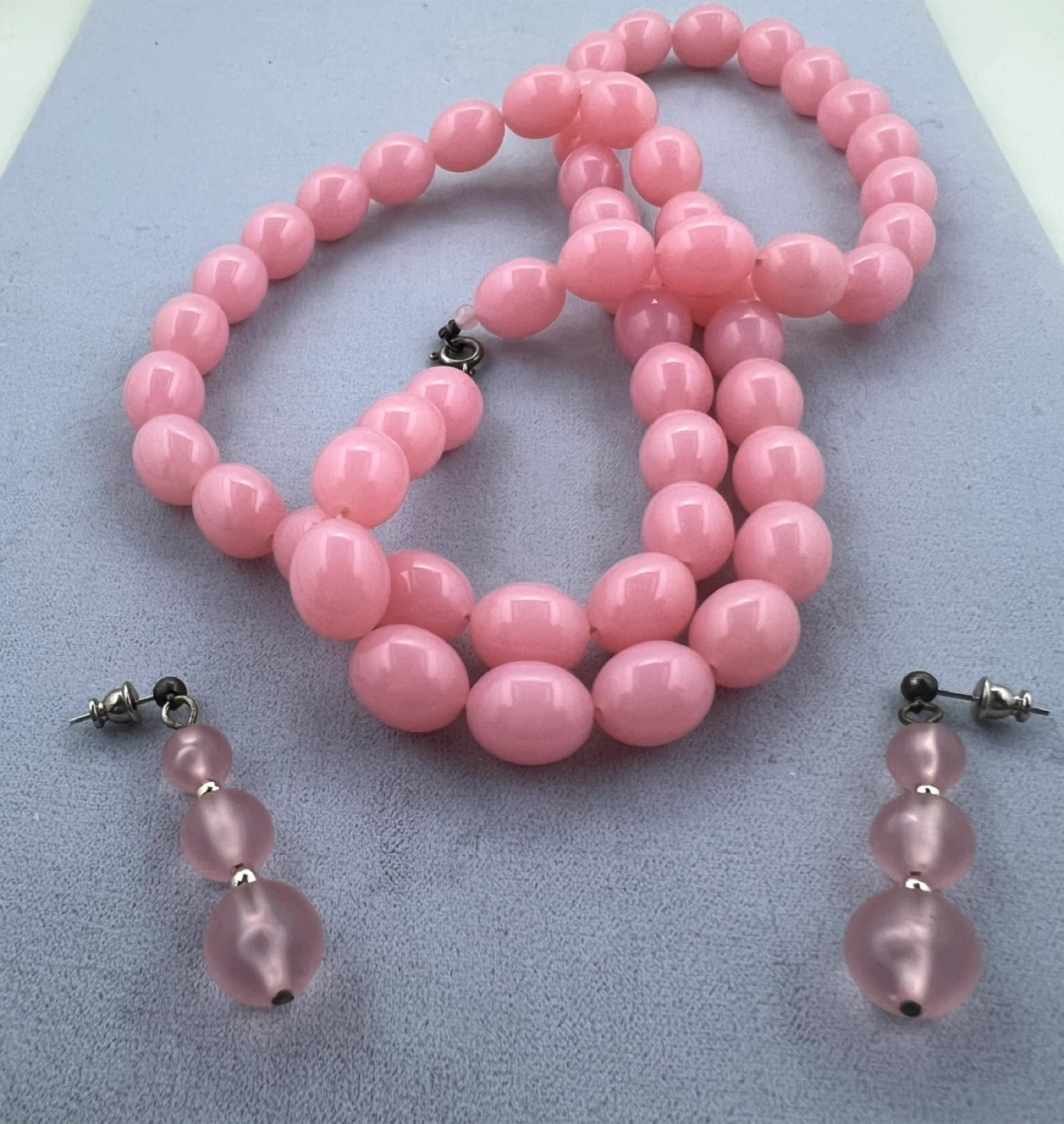 The necklace features large, smooth beads, while the earrings have smaller, frosted beads