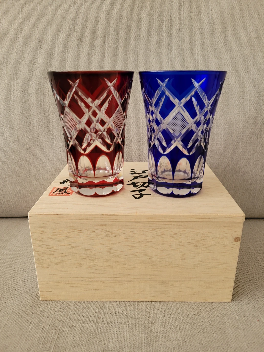 Japanese Edo Kiriko Cut Glass Tumblers Set - Red and Blue
