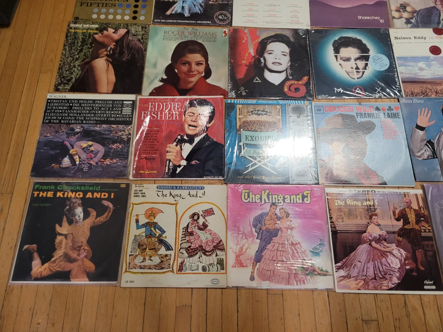 featuring various artists like Liberace, Joan Baez, and Roger Williams, along with soundtracks such as "The King and I" and "Exodus".