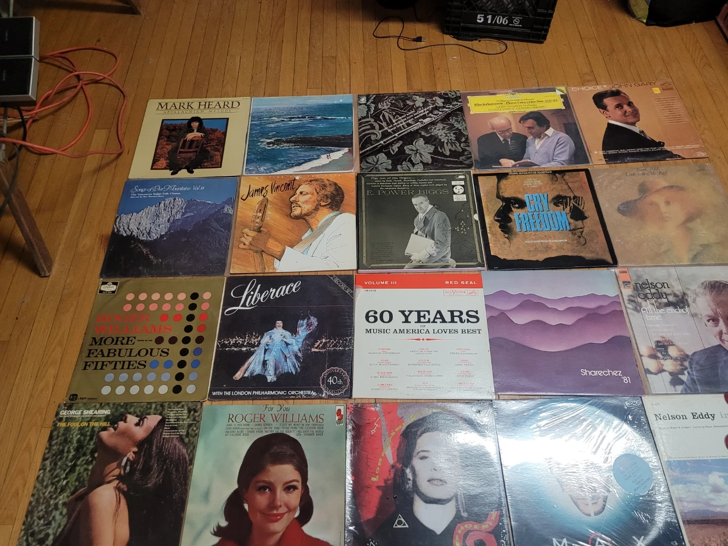 featuring various artists like Liberace, Joan Baez, and Roger Williams, along with soundtracks such as "The King and I" and "Exodus".
