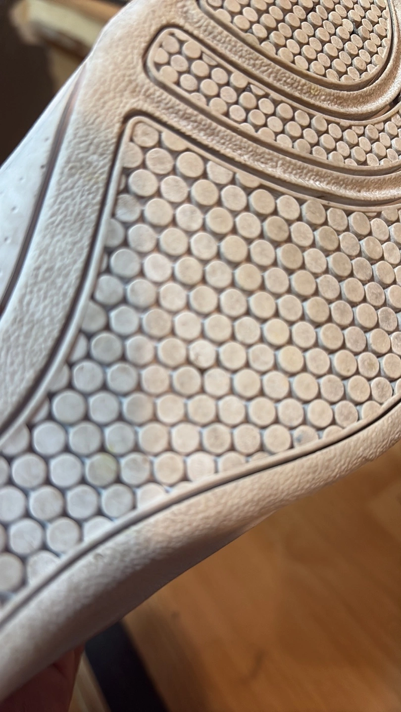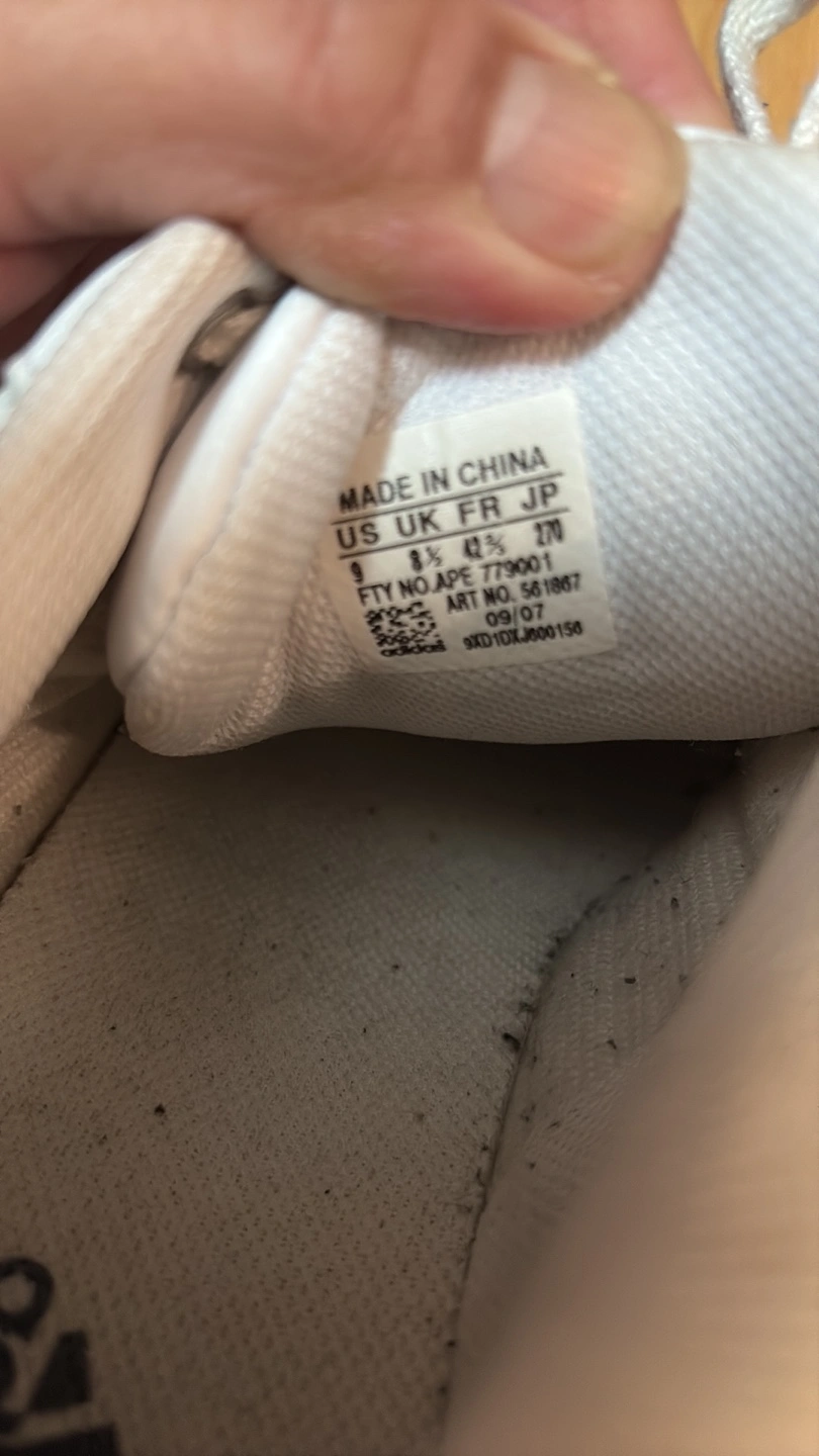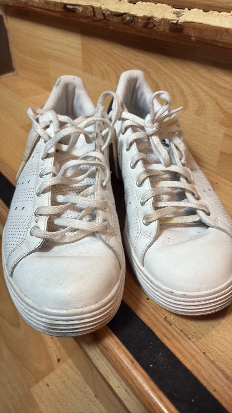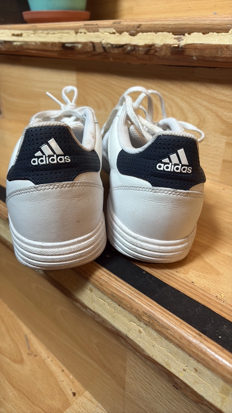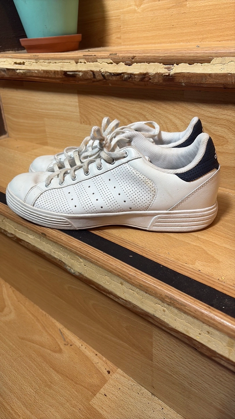 Pre-owned Adidas women's sneakers. White leather upper, navy accents. Lace-up closure. Good condition, some minor wear.