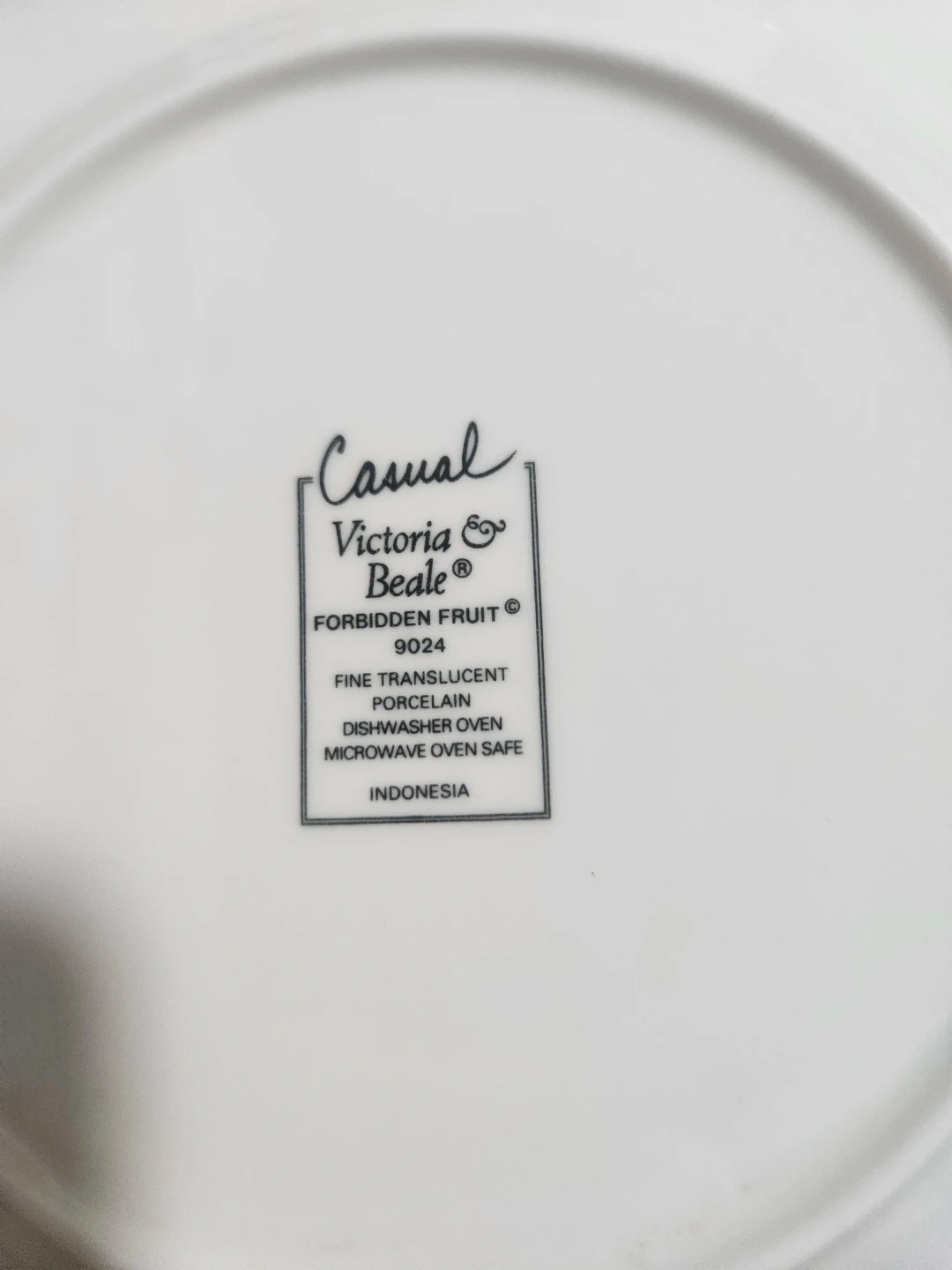 Set of four Victoria Beale Forbidden Fruit 9024 plates. These fine translucent porcelain plates feature a colorful fruit design. They're microwave and oven safe and made in Indonesia.