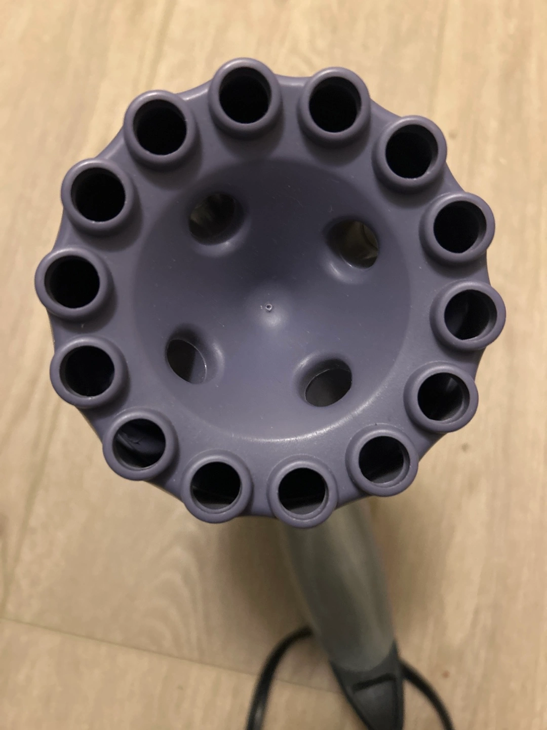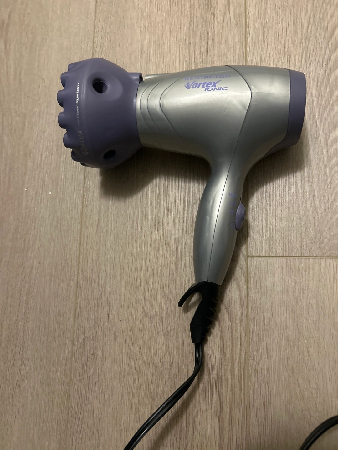 This Remington Vortex Ionic hair dryer comes with a diffuser attachment. It's a silver and purple colour. The dryer uses ionic technology for styling.