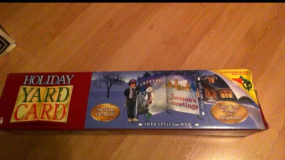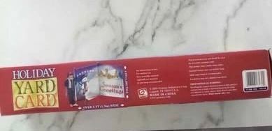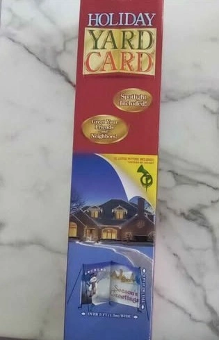 Selling a Holiday Yard Card by Gemmy Industries! It's over 5 ft (1.5m) wide and 4 ft (1.2m) tall. It includes a spotlight and is for indoor or outdoor use. Easy assembly is required. Please note that the lightbulb is not included, but a 45 watt lamp is recommended. You can install it how ever you like, with light, without light. Straight or angled. The design options are endless.