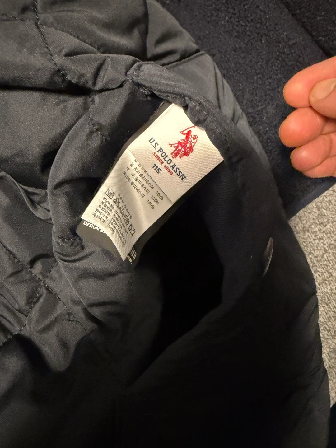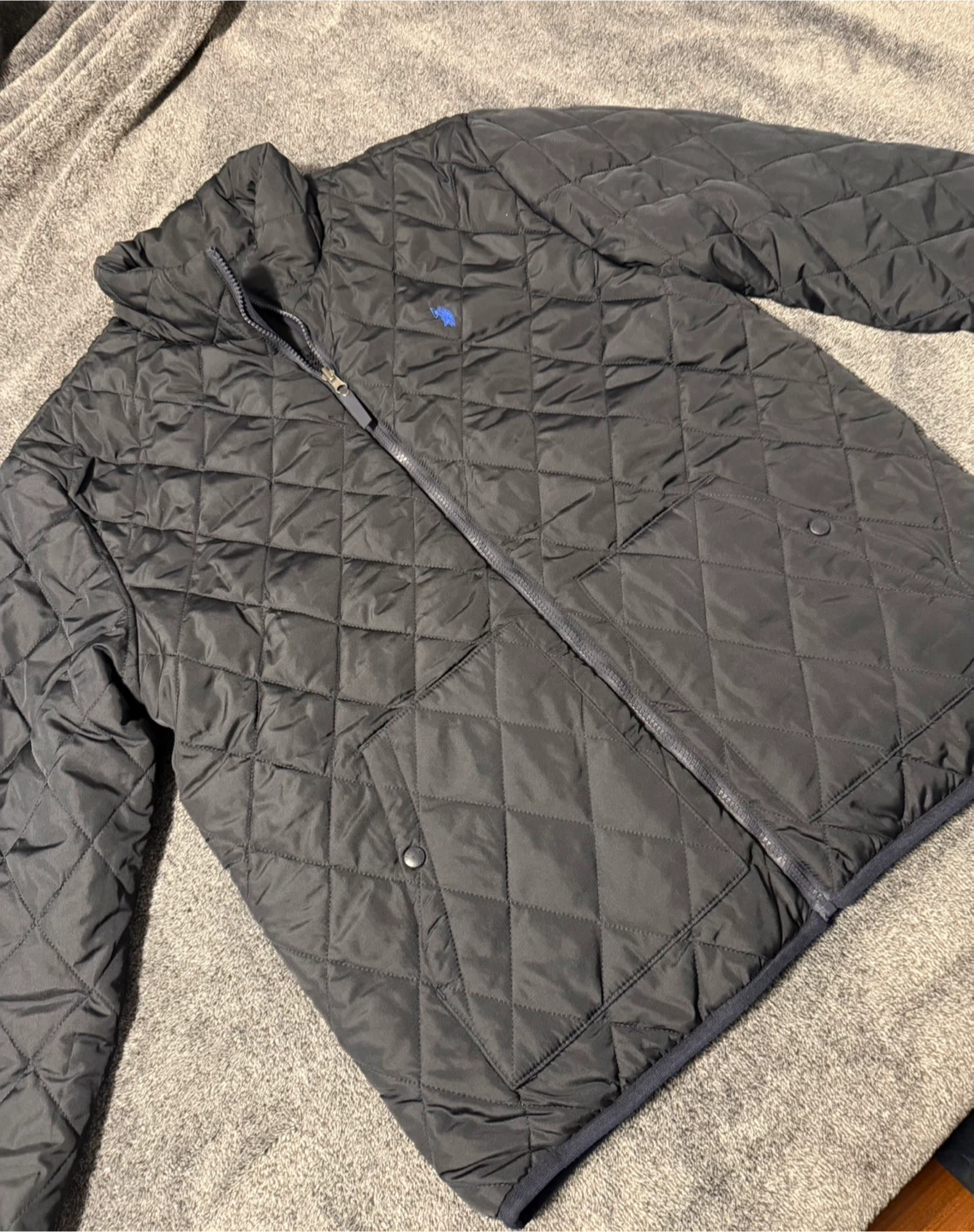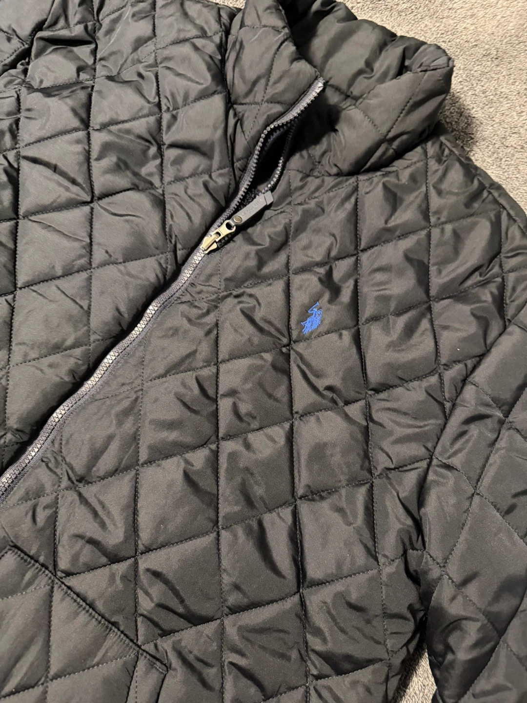 This is a U.S. Polo Assn. quilted jacket with a fleece lining. It features a full zip closure and two front pockets. It's a great layering piece for cooler weather!