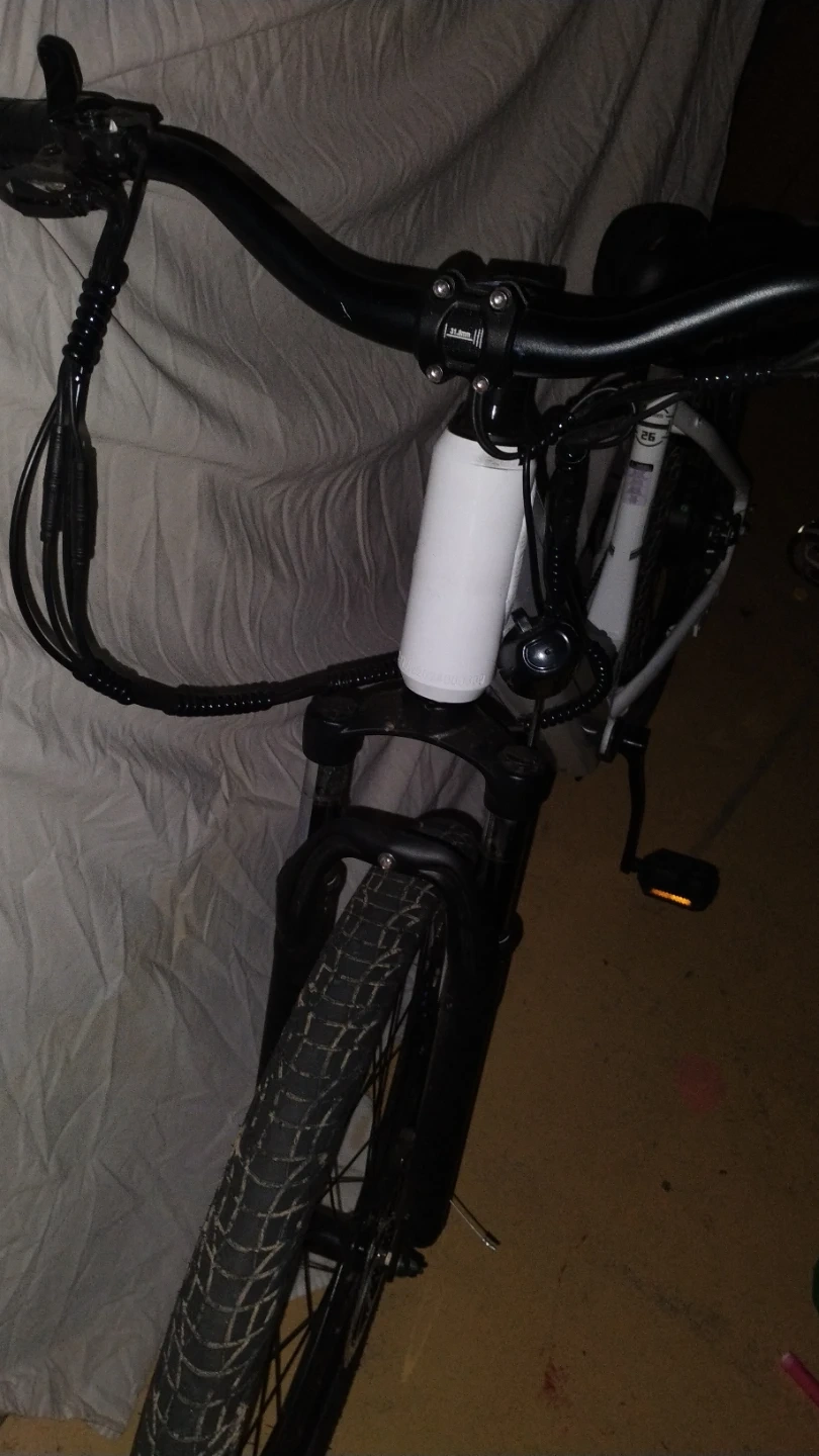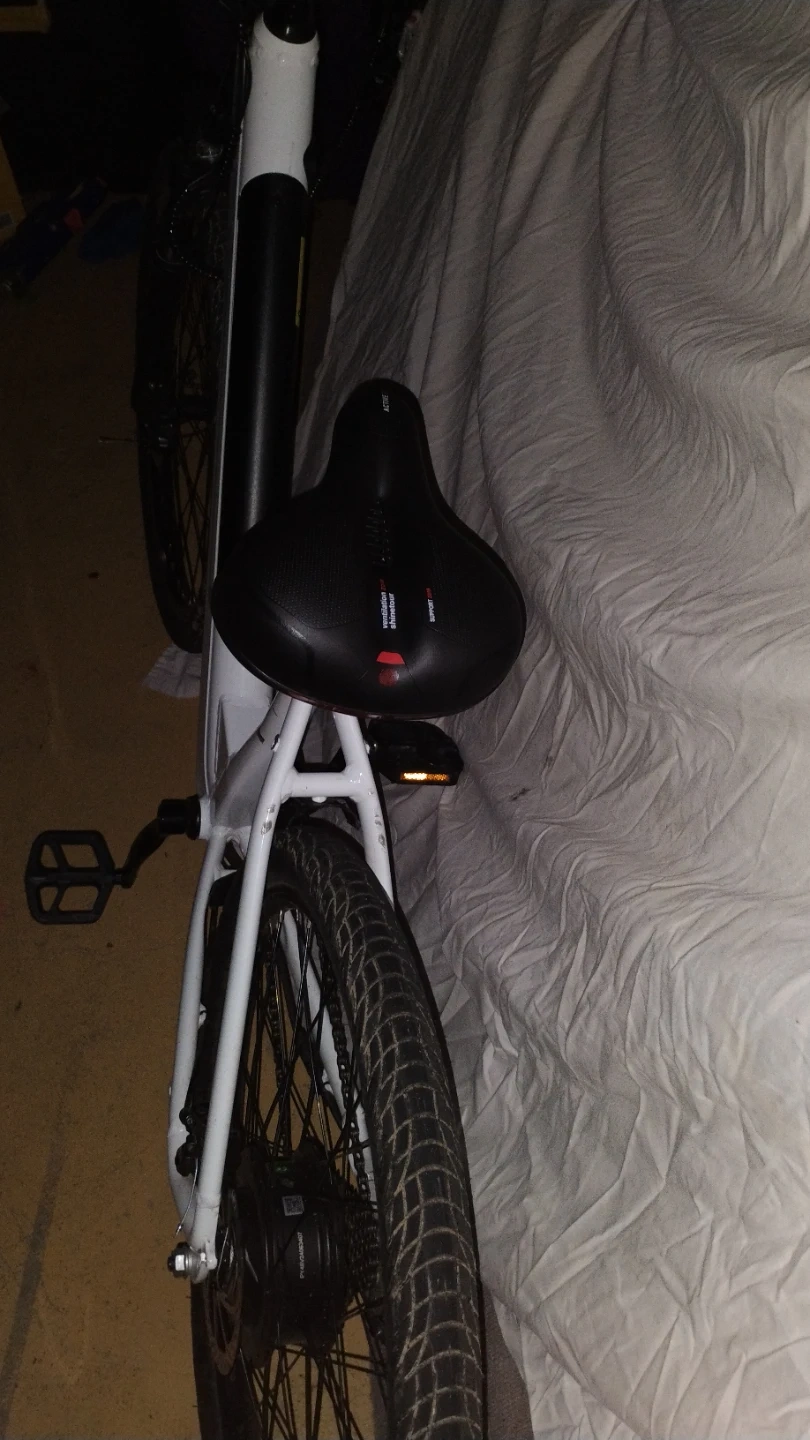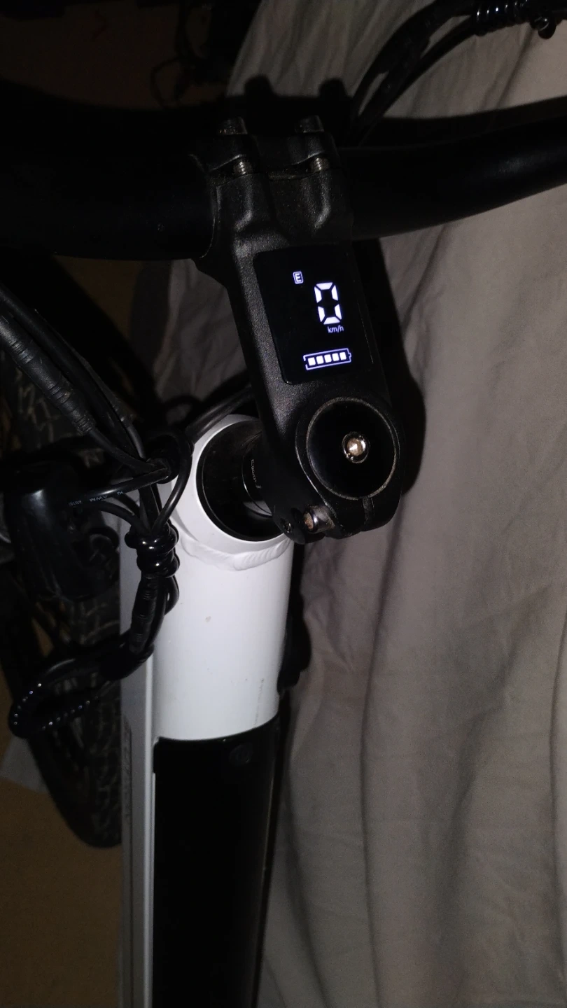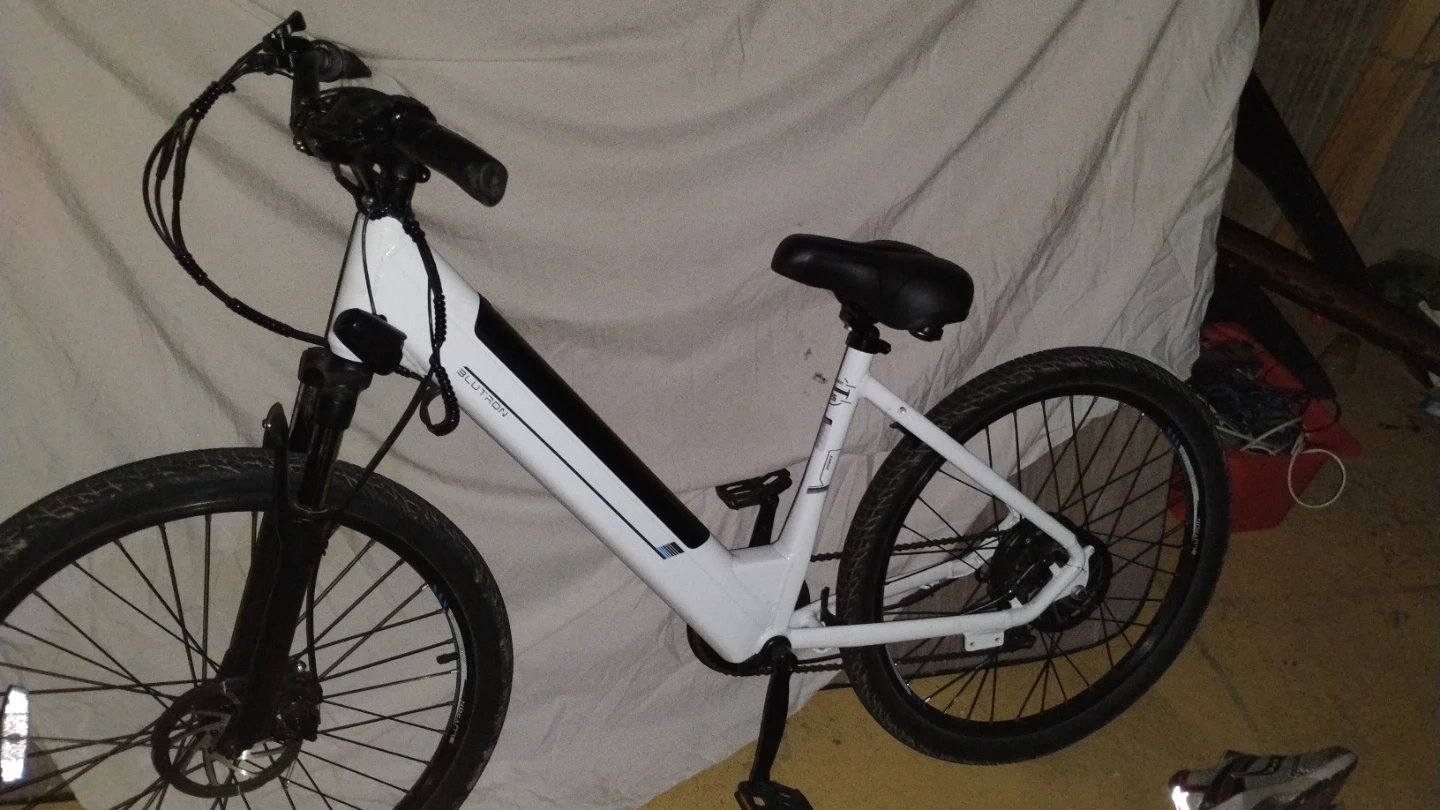 White electric bike with a digital display showing speed and battery. It's a sturdy build with front suspension. Suitable for commuting or recreational rides. Bought for 1700 but did use it over the past year. Can give more details if you contact me