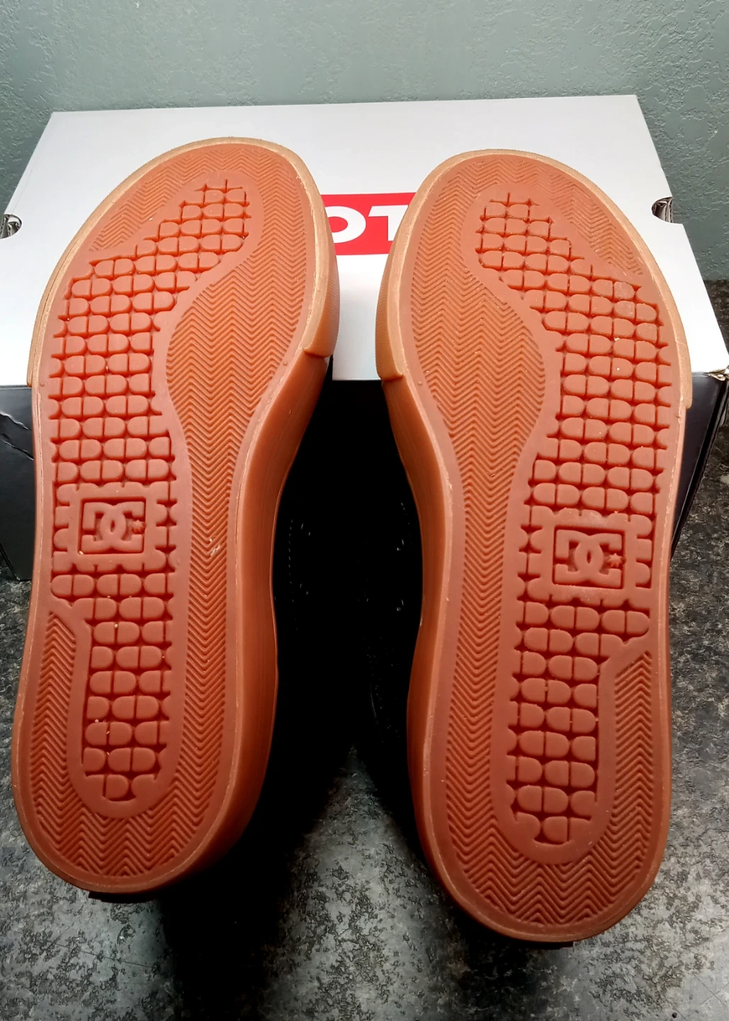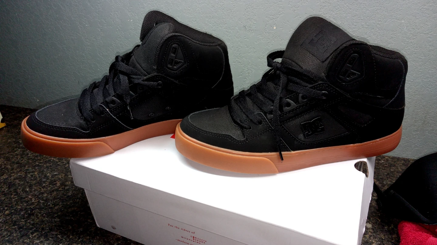 DC Pure High-Top WC skateboard shoes in black with a gum sole. These men's shoes are size 9.5 US. They feature a leather upper and rubber sole. Designed in the USA. Brand new never warn