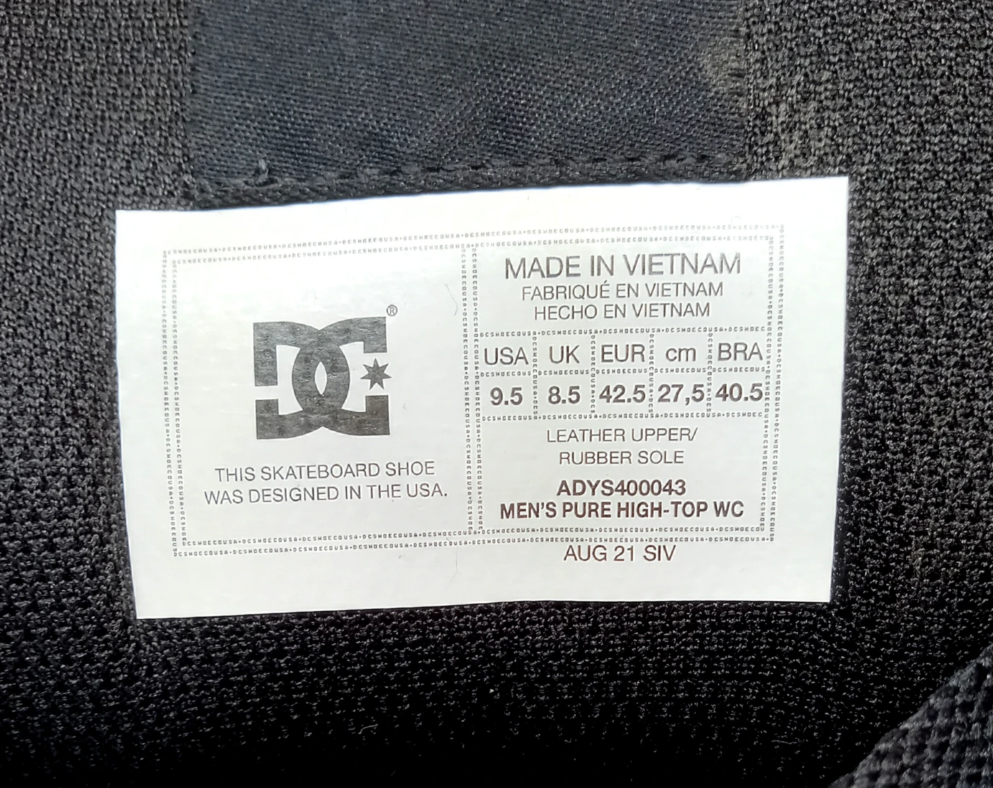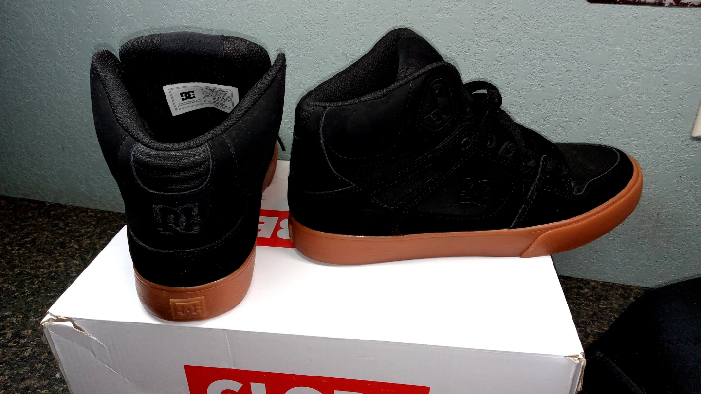 DC Pure High-Top WC skateboard shoes in black with a gum sole. These men's shoes are size 9.5 US. They feature a leather upper and rubber sole. Designed in the USA. Brand new never warn