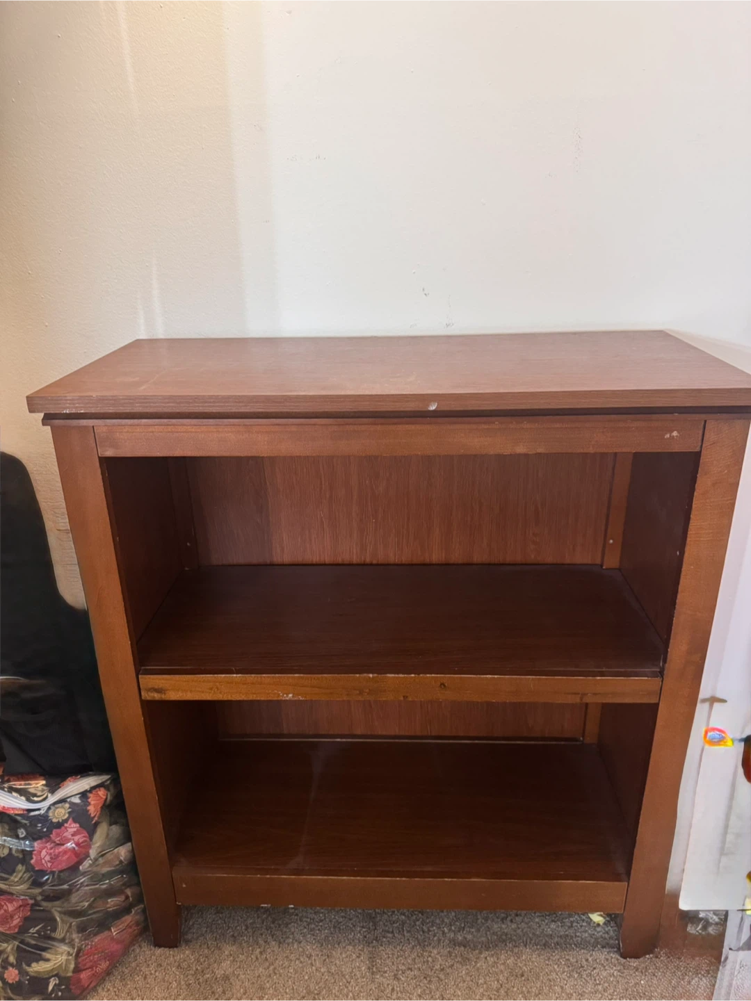 This is a brown wooden bookcase with three shelves. It's made of wood and has a simple, sturdy design. The shelves offer ample storage space for books or decor. It's a practical piece for any room!