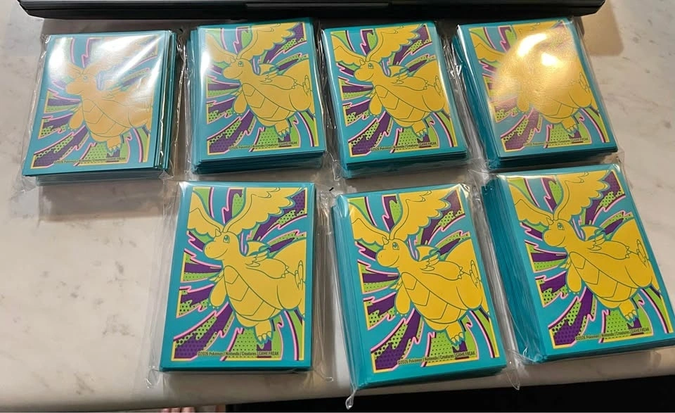 Awesome Pokémon card sleeves with a Dragonite design. All new and sealed. Great for protecting your cards! 10 packs available, 65 sleeves in each pack. $5 per pack.