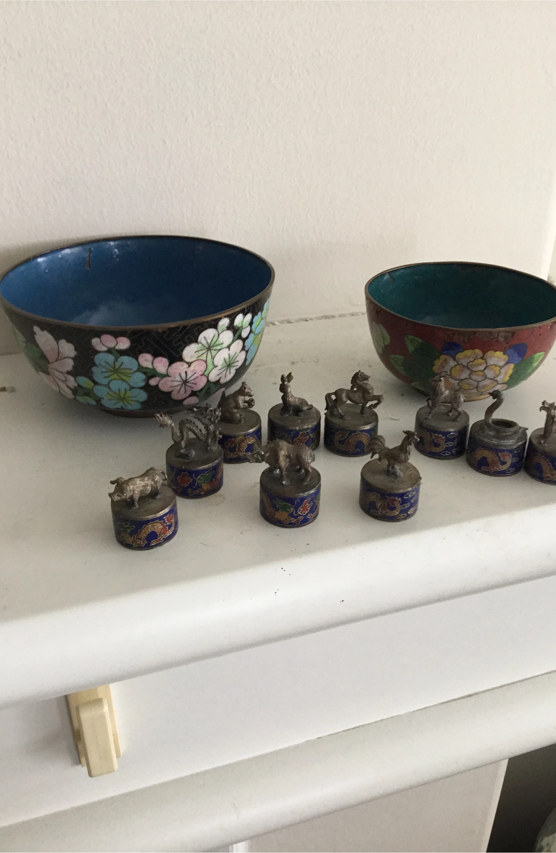 60Selling a couple of Cloisonné bowls with floral designs and a set of zodiac animal figurines. The bowls feature vibrant colours and intricate floral patterns, while the figurines depict ten animals of the Chinese zodiac. They would be a nice addition to any collection or home decor
