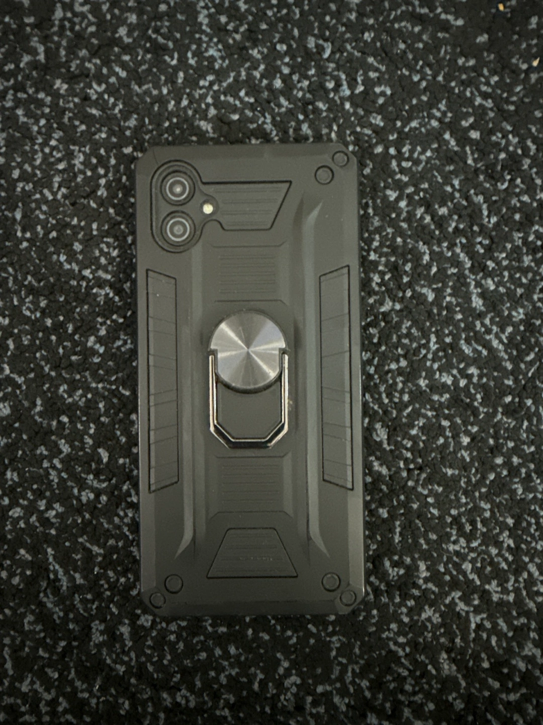 Selling a black phone case with a convenient ring holder on the back. It's in great condition and ready to protect your phone!