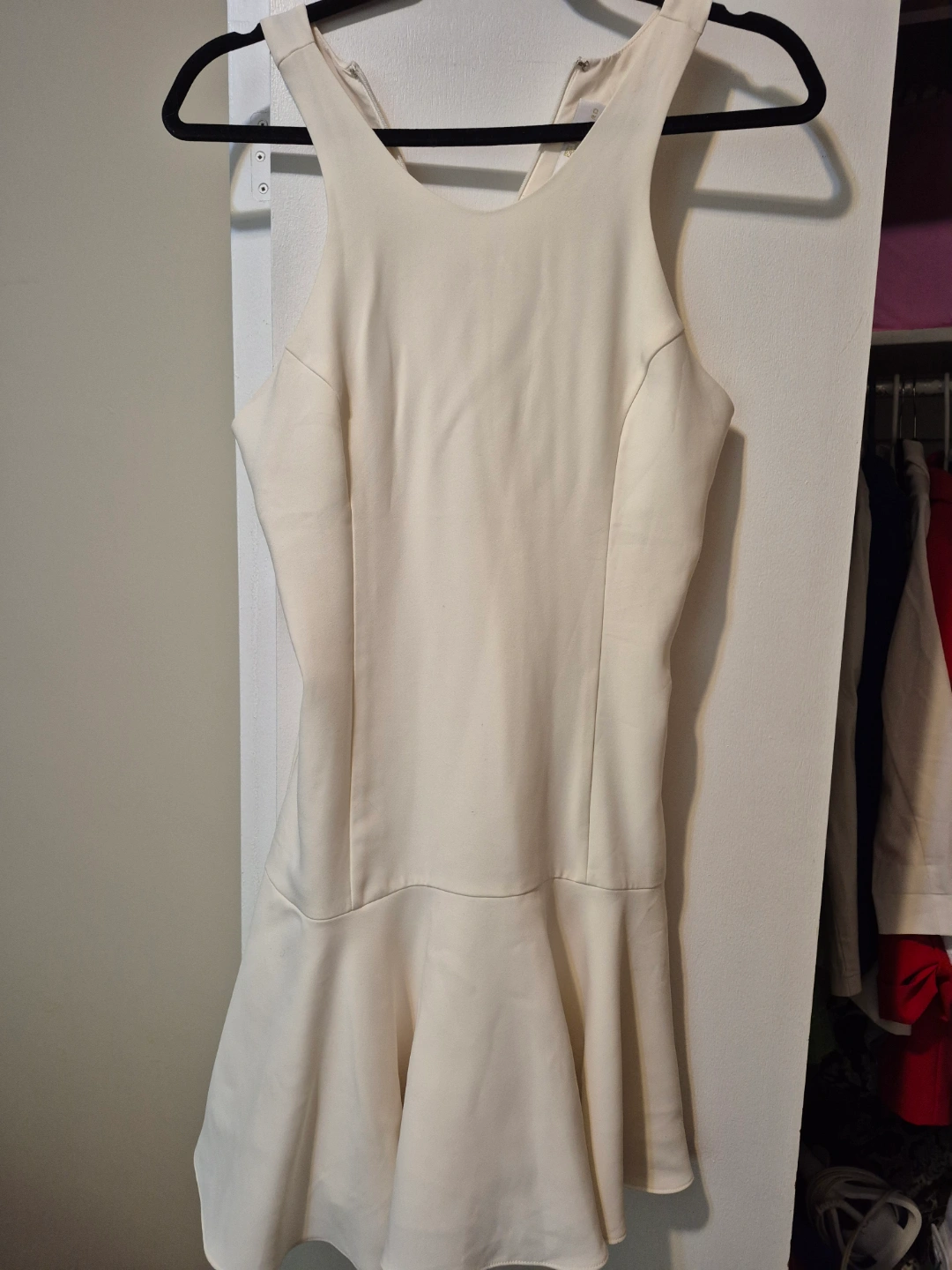 Off-white dress. Sleeveless design. Features a flared skirt. Great for a casual summer evening out.
