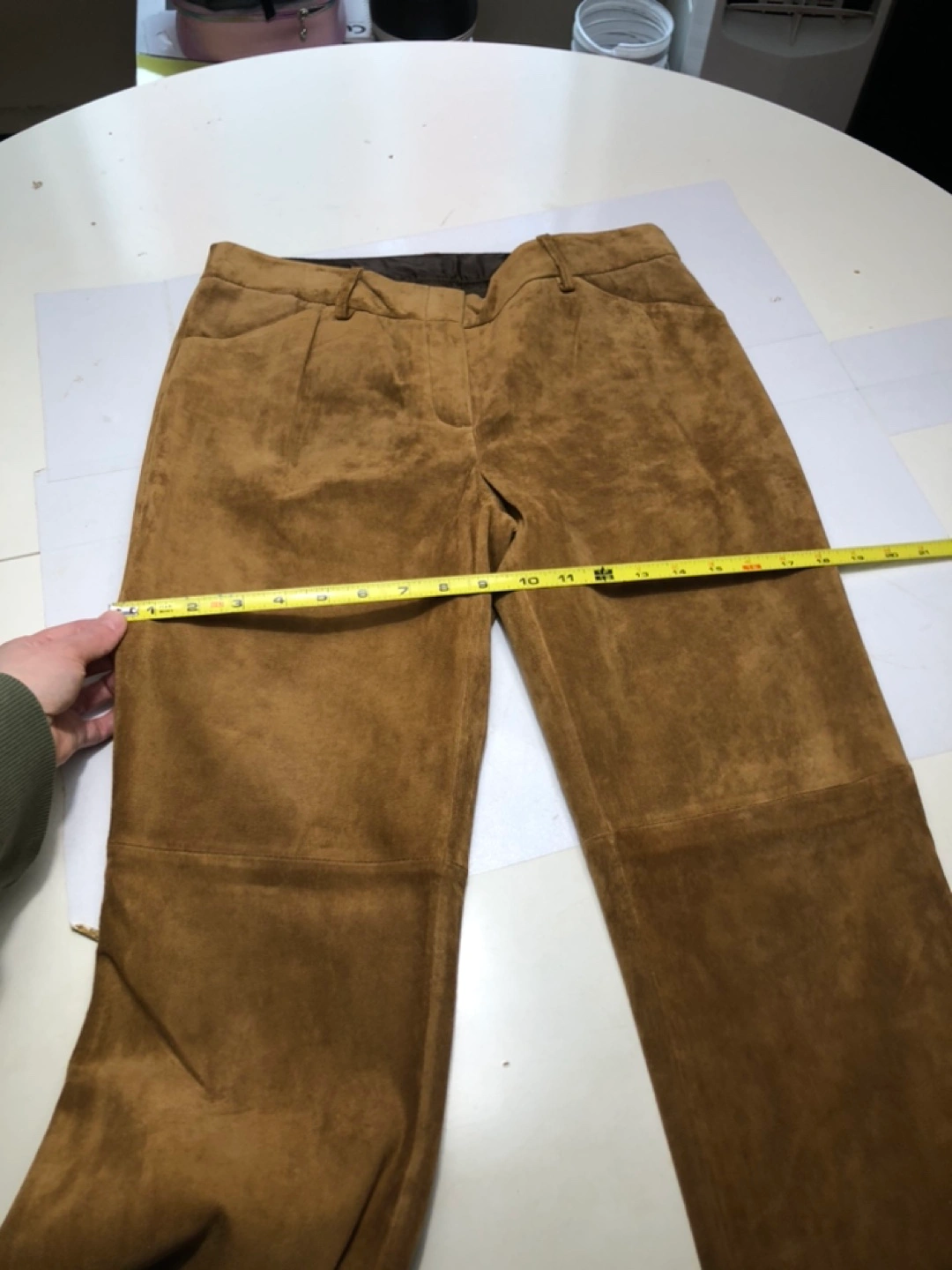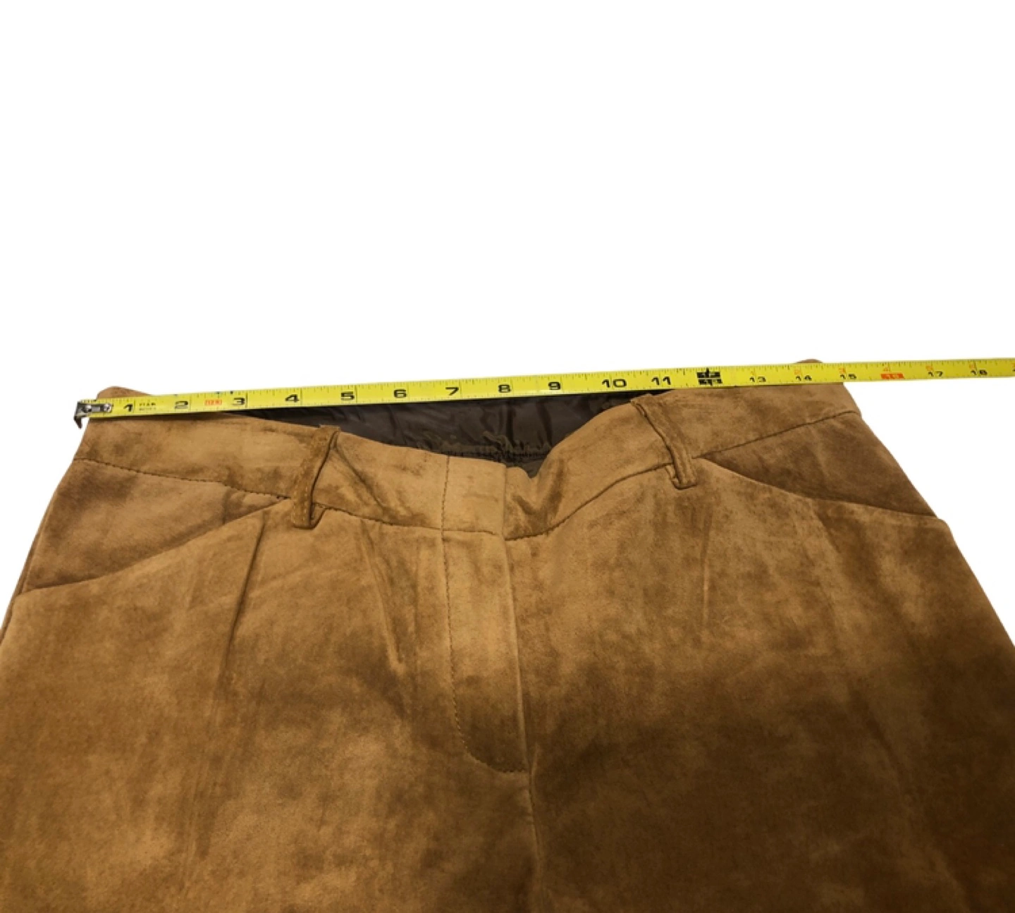 These tan suede flare pants are fully lined and very soft and comfortable to wear. They are mid-rise, and have a straight leg with a slight bootcut. Made from washable suede (hand-wash and line dry).