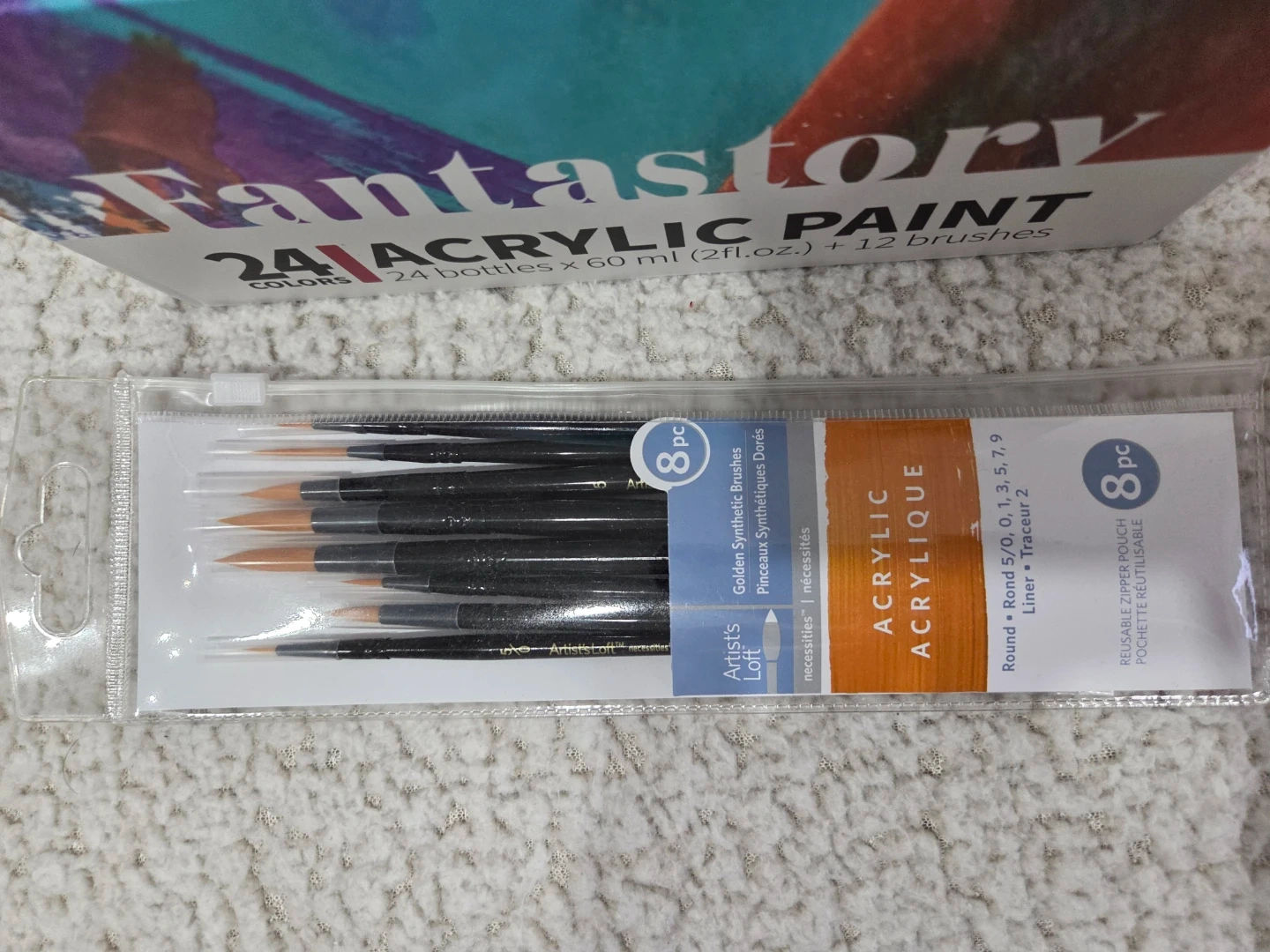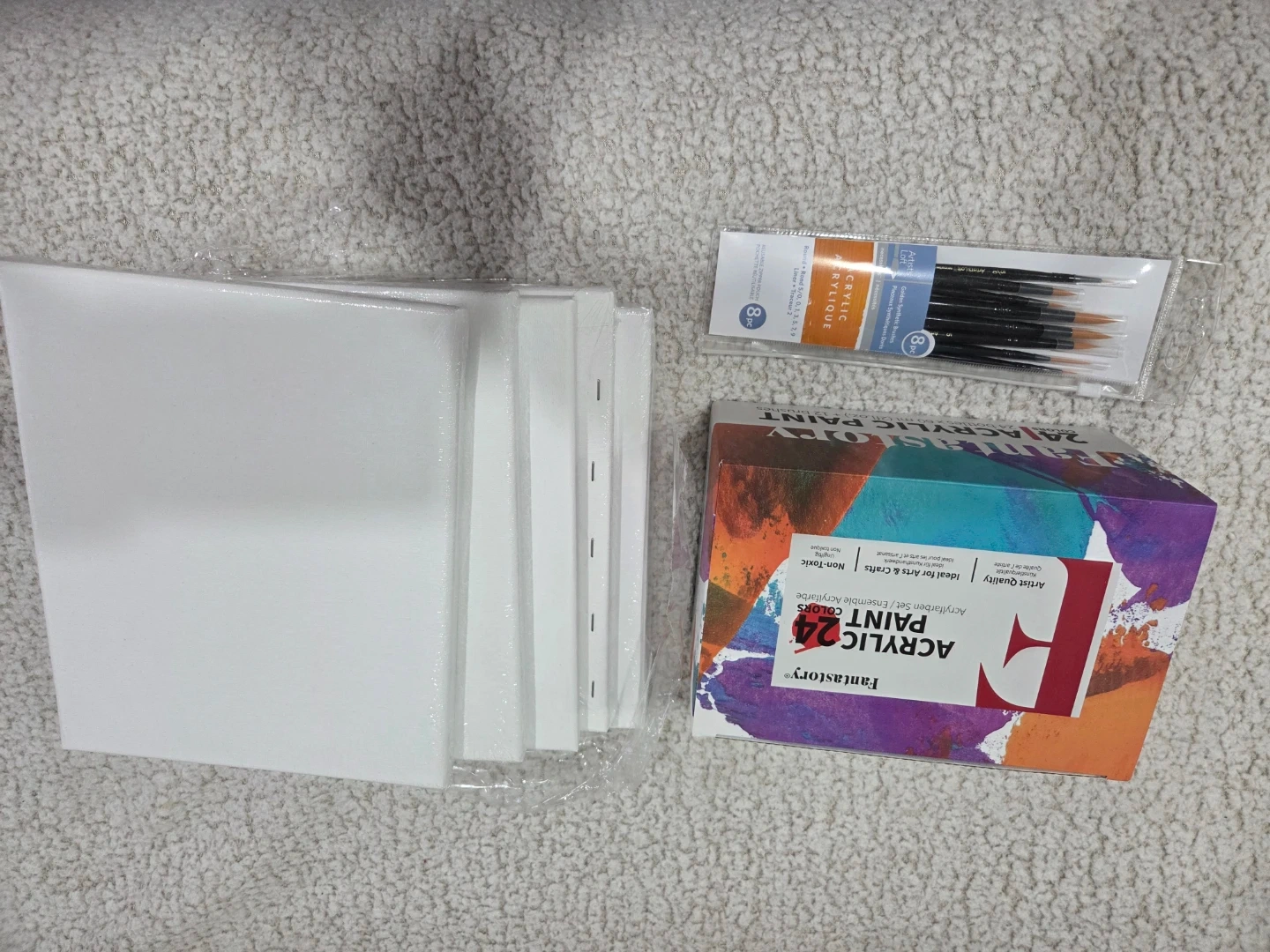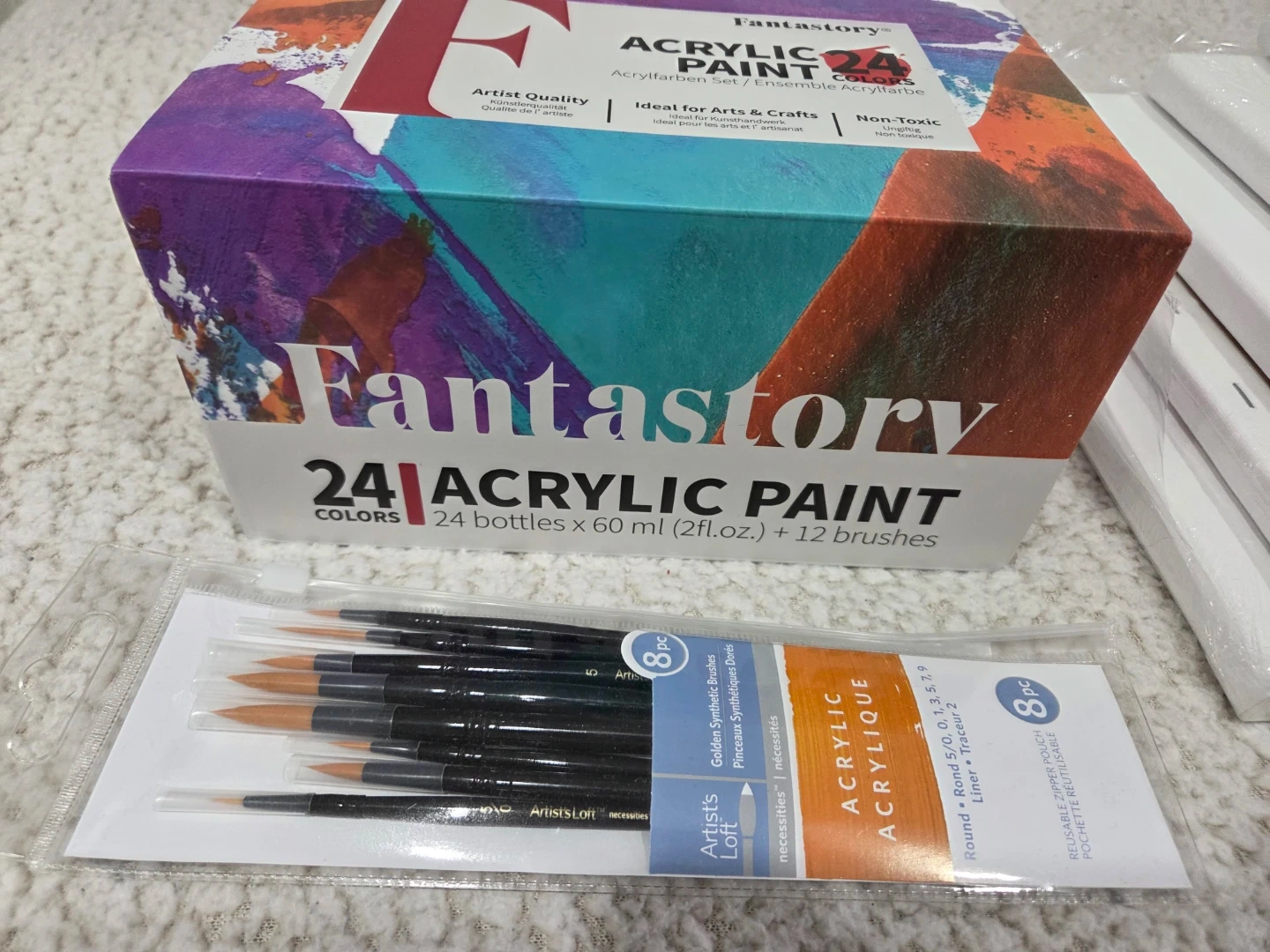 Selling a new Fantastory acrylic paint set! It includes 24 bottles of acrylic paint that are lightly used. Also included are 5 10"×8" canvases (new) and an 8-piece set of Artist's Loft acrylic brushes (new).