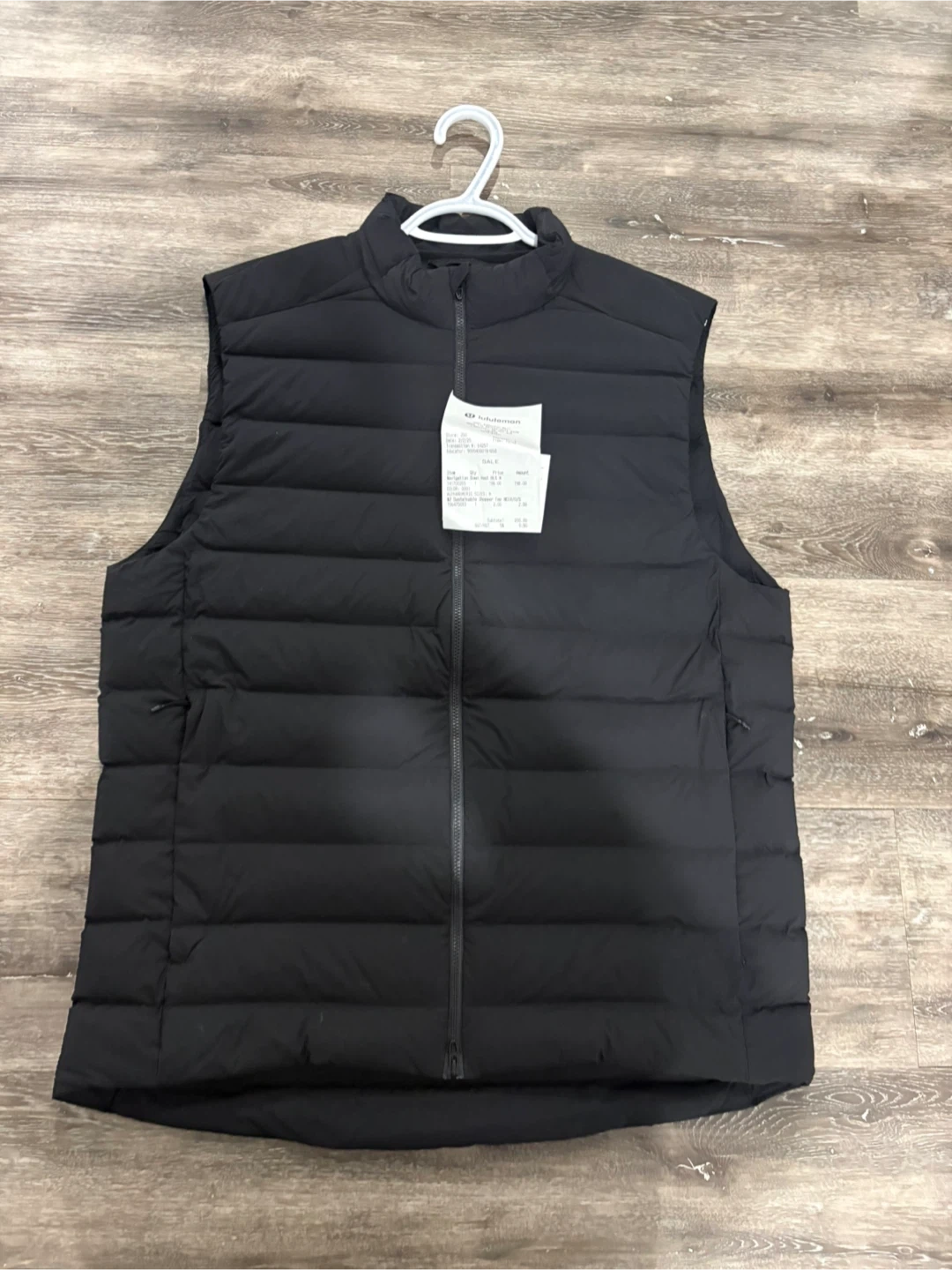 Lululemon black quilted down vest. It has a full zip front and a mock neck. This vest is great for layering on cooler days. Comes with receipt
