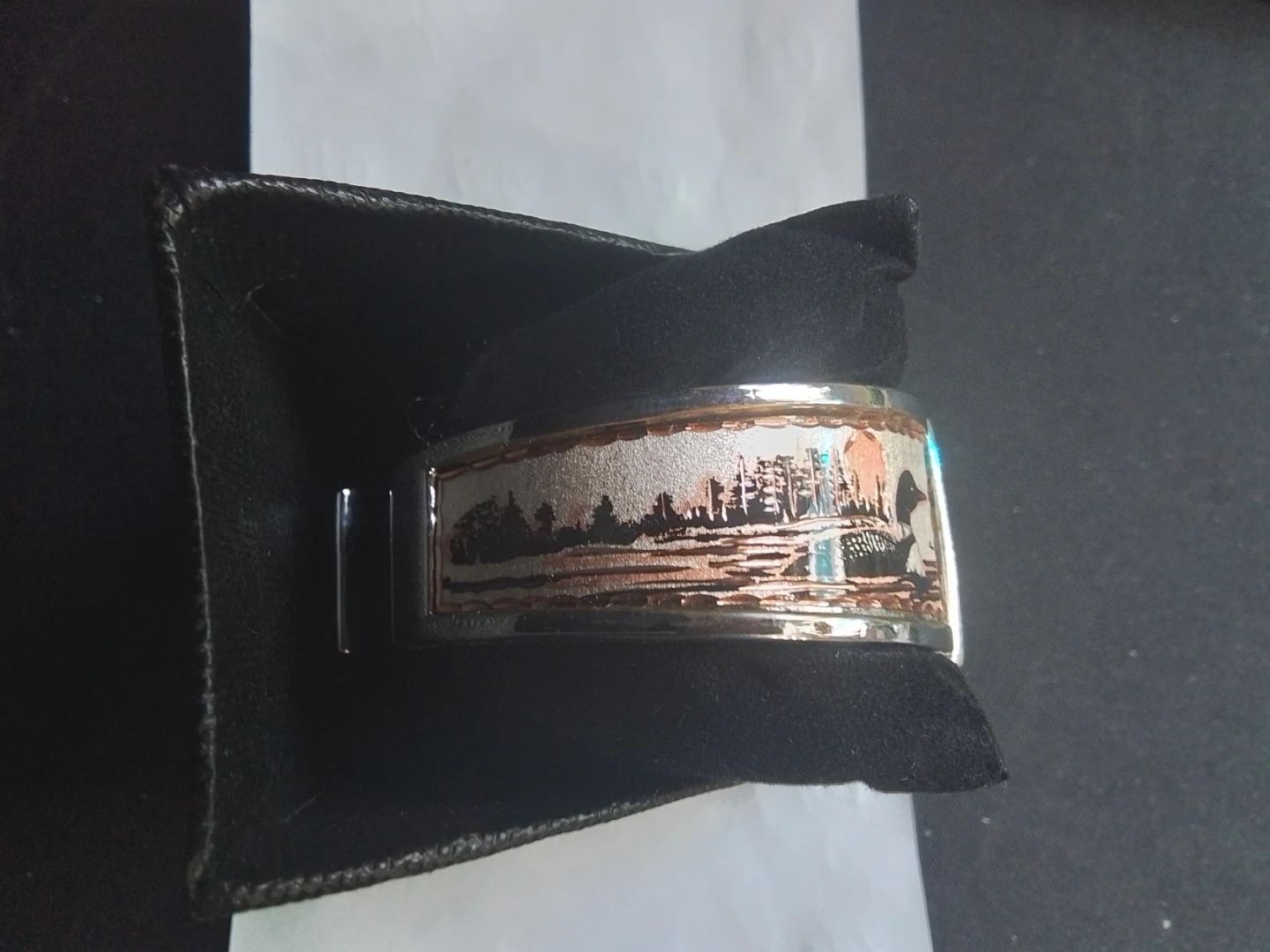 This vintage Copper Reflections bangle quartz watch features a silver-plated and copper indigenous design bracelet, complete with its original box. The watch has a square face with an easy-to-read dial.