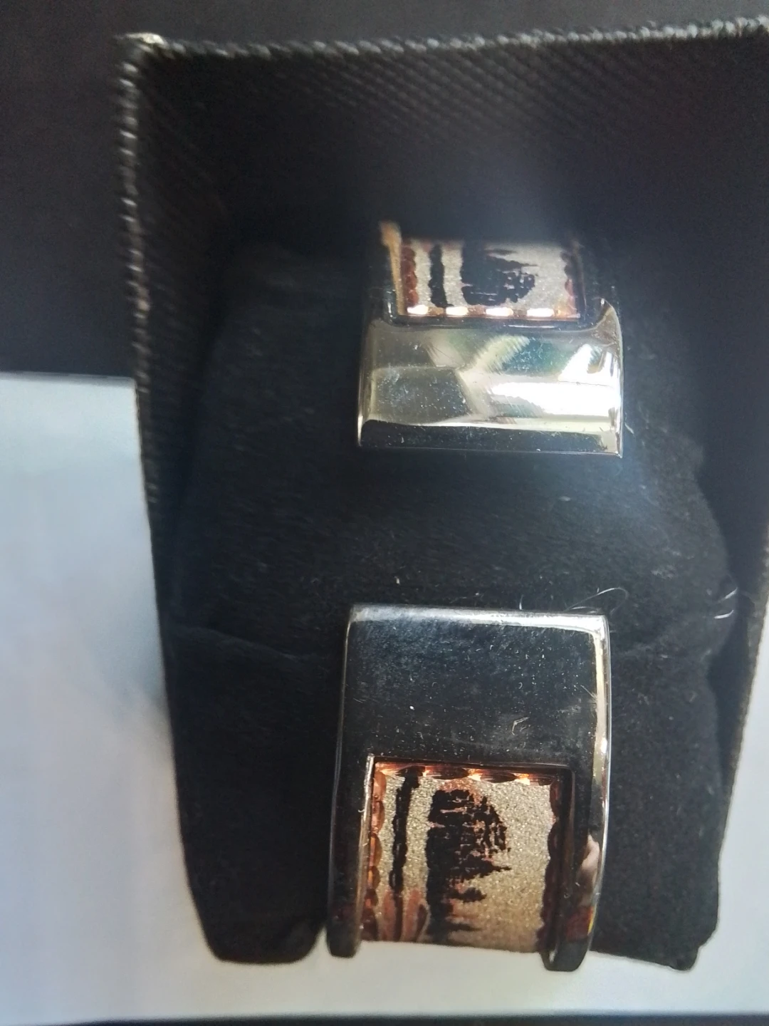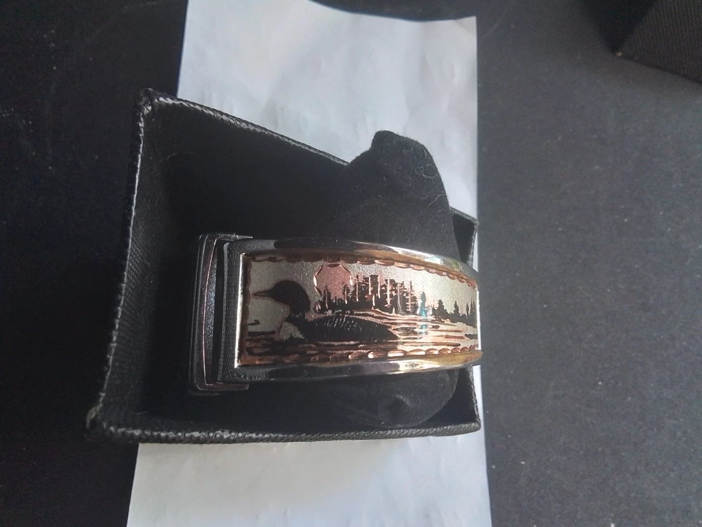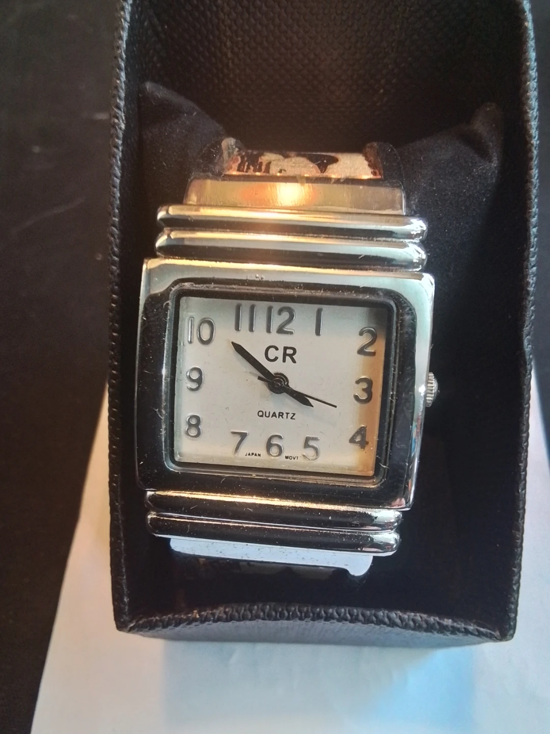 This vintage Copper Reflections bangle quartz watch features a silver-plated and copper indigenous design bracelet, complete with its original box. The watch has a square face with an easy-to-read dial.