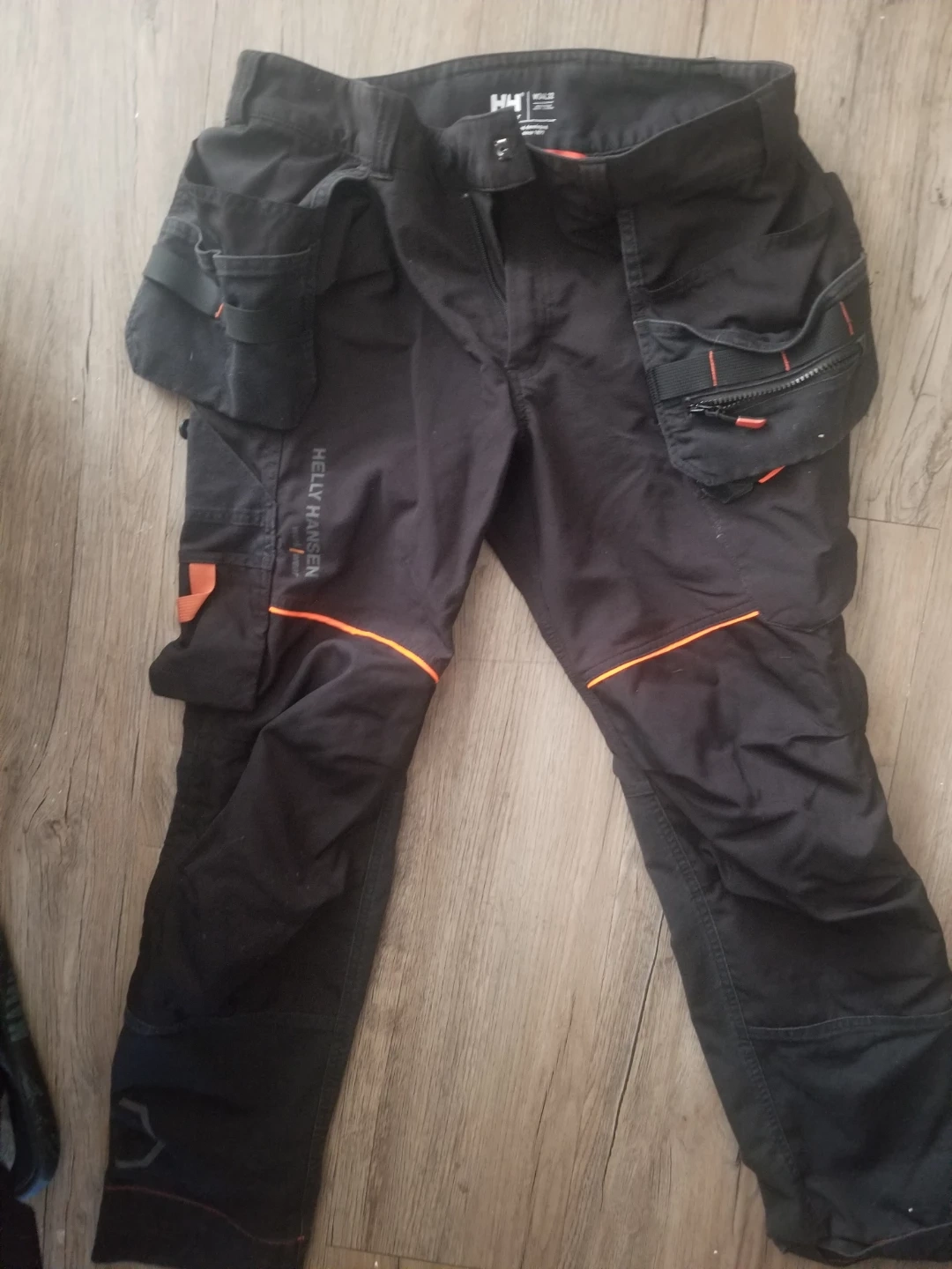 These are Helly Hansen work pants in black. Size W34L32. They're designed and developed in Norway since 1877. These pants feature multiple pockets for utility.