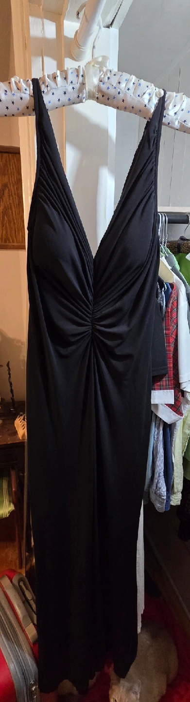 Selling a lovely full length lined black dress from Enchanté, size 14. It's made of 92% polyester and 8% spandex. The style code is CD8622. Great for an evening out or a special occasion!