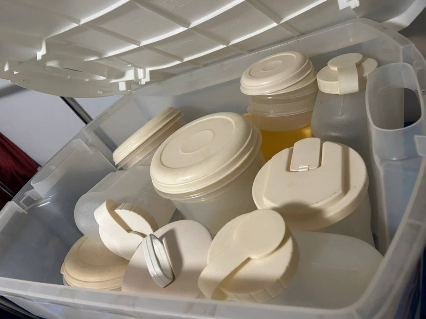 It's a clear plastic Rubbermaid container with a white lid.
