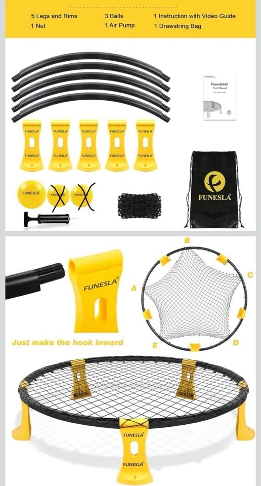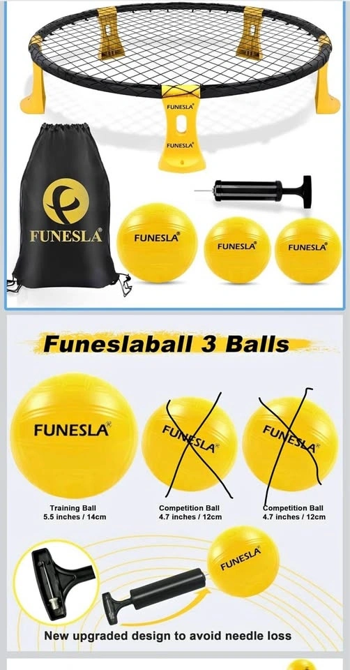 FUNESLA Spikeball-style outdoor game set in good working condition. Great for backyard fun, beach days, or park games with family and friends. What’s included: ✔️ Net ✔️ Frame & legs (complete set) ✔️ 2 balls included ✔️ Air pump ✔️ Carry/drawstring bag Easy to assemble, lightweight, and fun for all ages. Everything else is complete and works as expected.