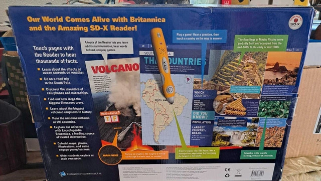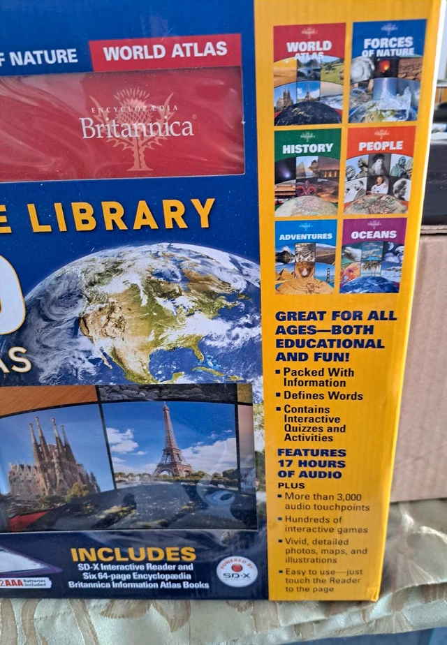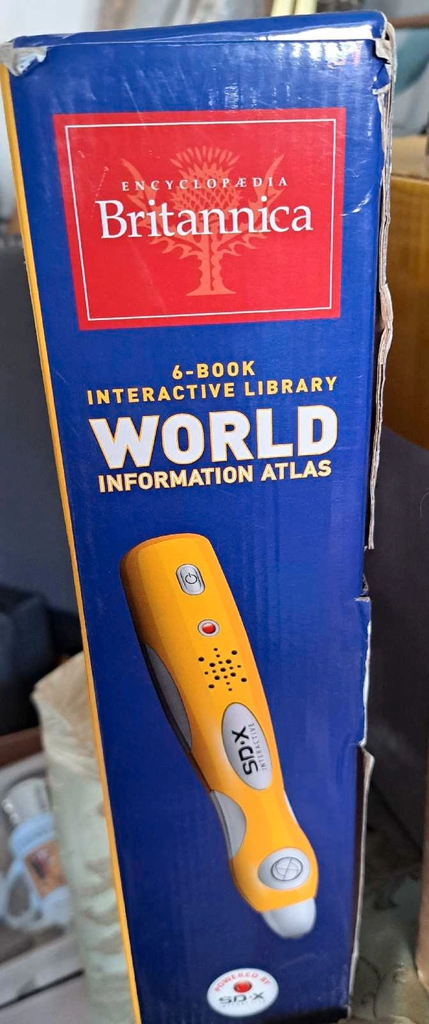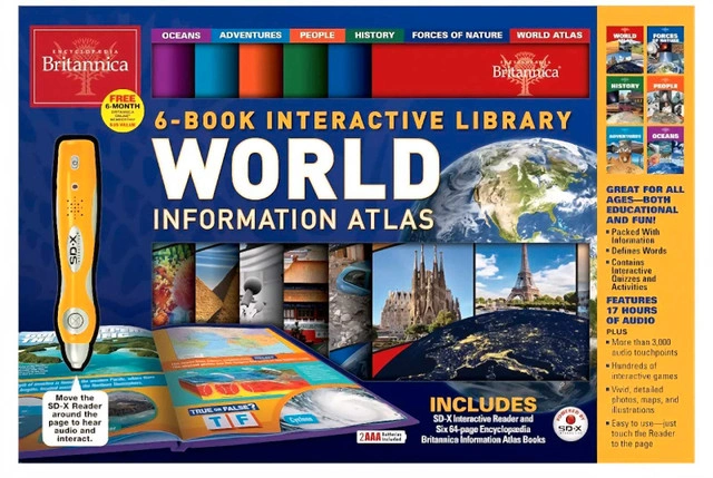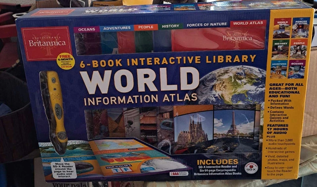 The product is the Encyclopædia Britannica 6-Book Interactive Library: World Information Atlas. This set is a children's educational product that includes six hardcover books and an interactive SD-X reader pen. The books cover topics such as Oceans, Adventures, People, History, Forces of Nature, and World Atlas. The SD-X reader pen can interact with the pages, providing over 17 hours of audio, including quizzes and games. The set is designed for all ages and features vivid photos, illustrations, and maps. For Sale By: Owner