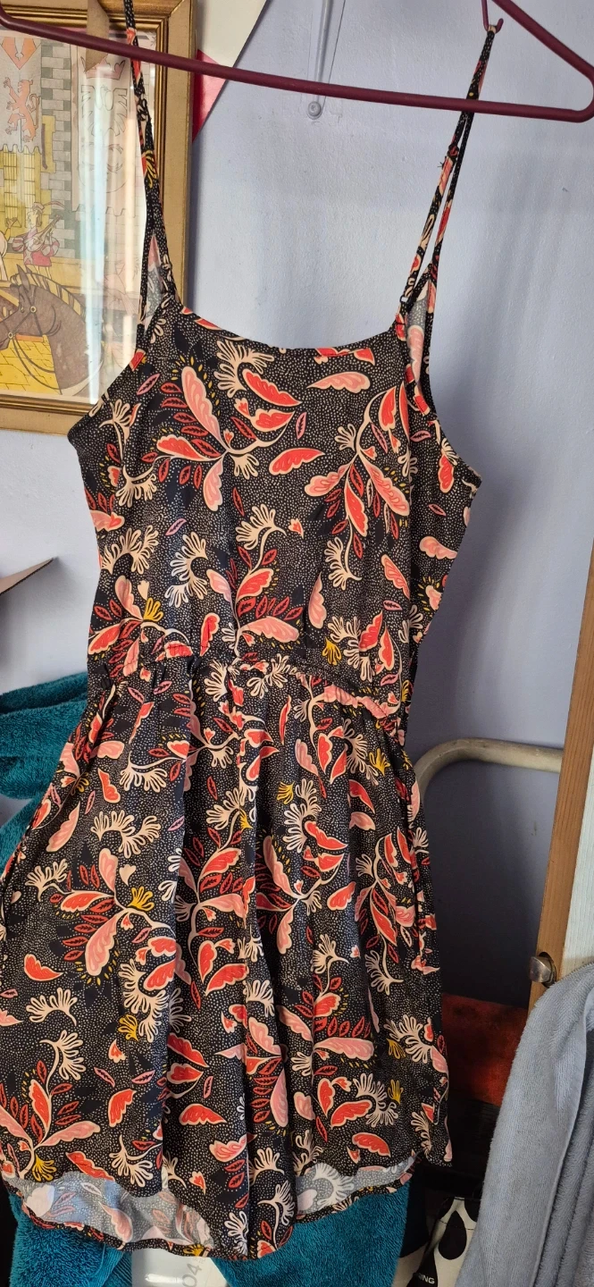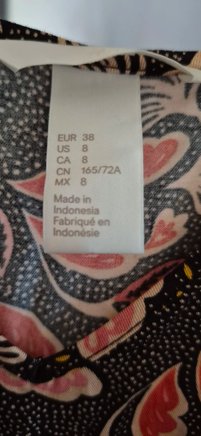 Cute H&M romper with a fun floral pattern! It's a size 8. Pre-owned, side pockets. in great condition. No tares, rips. Kept well. 💯 % Viscose Rayon fibers - which is Cynthetic Silk.