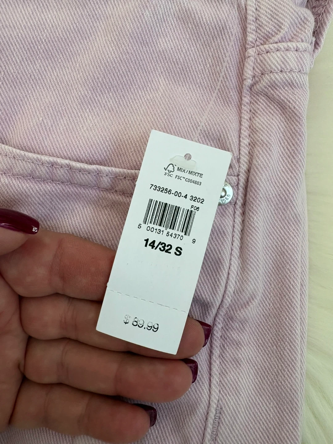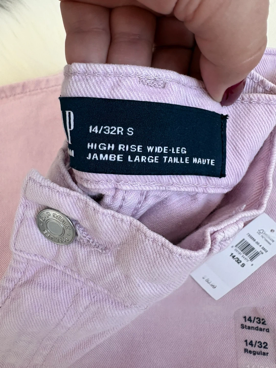 These GAP High Rise Wide-Leg Jeans are a size 14/32S. They're a lovely lilac pink colour. Denim material.