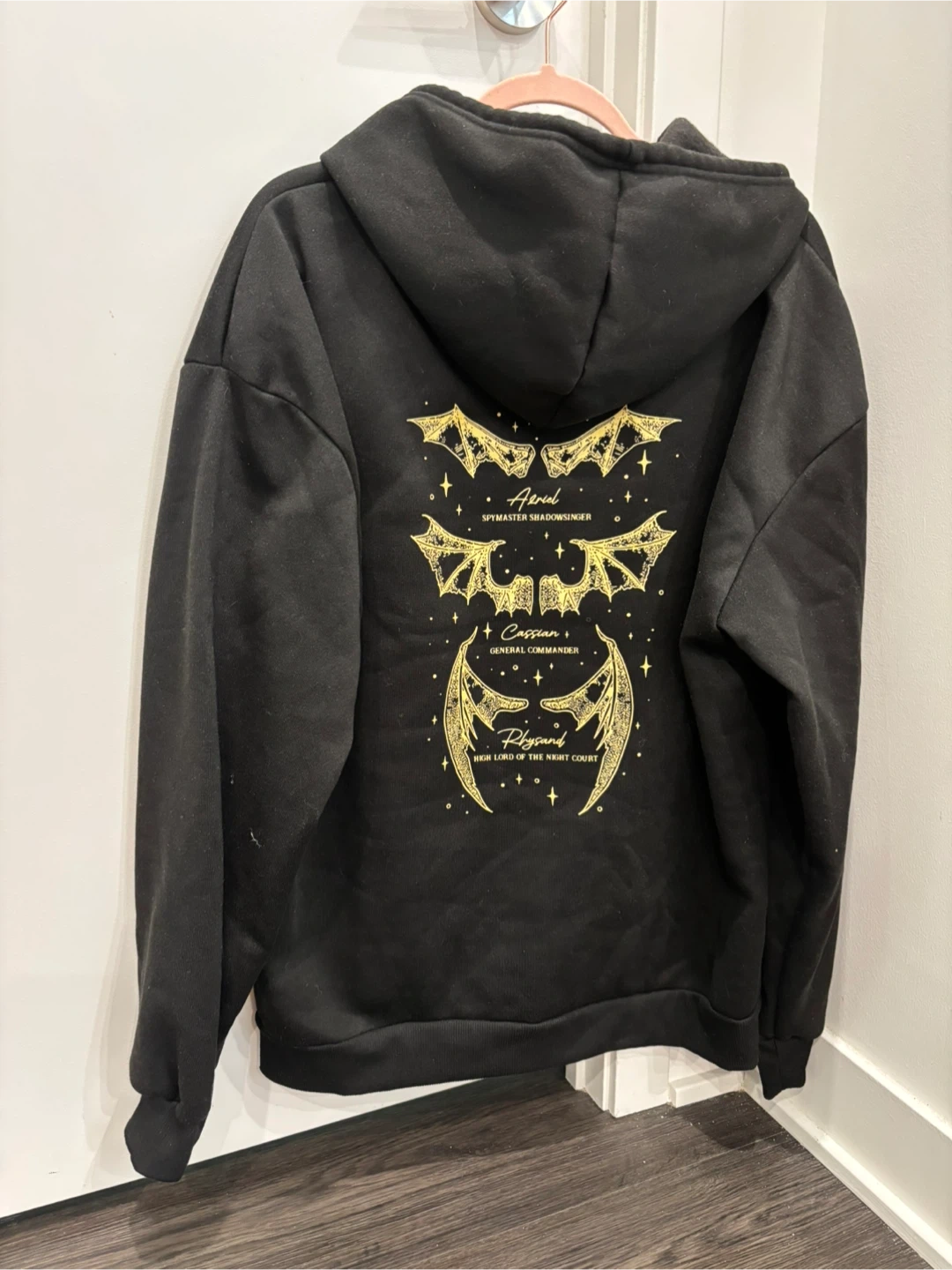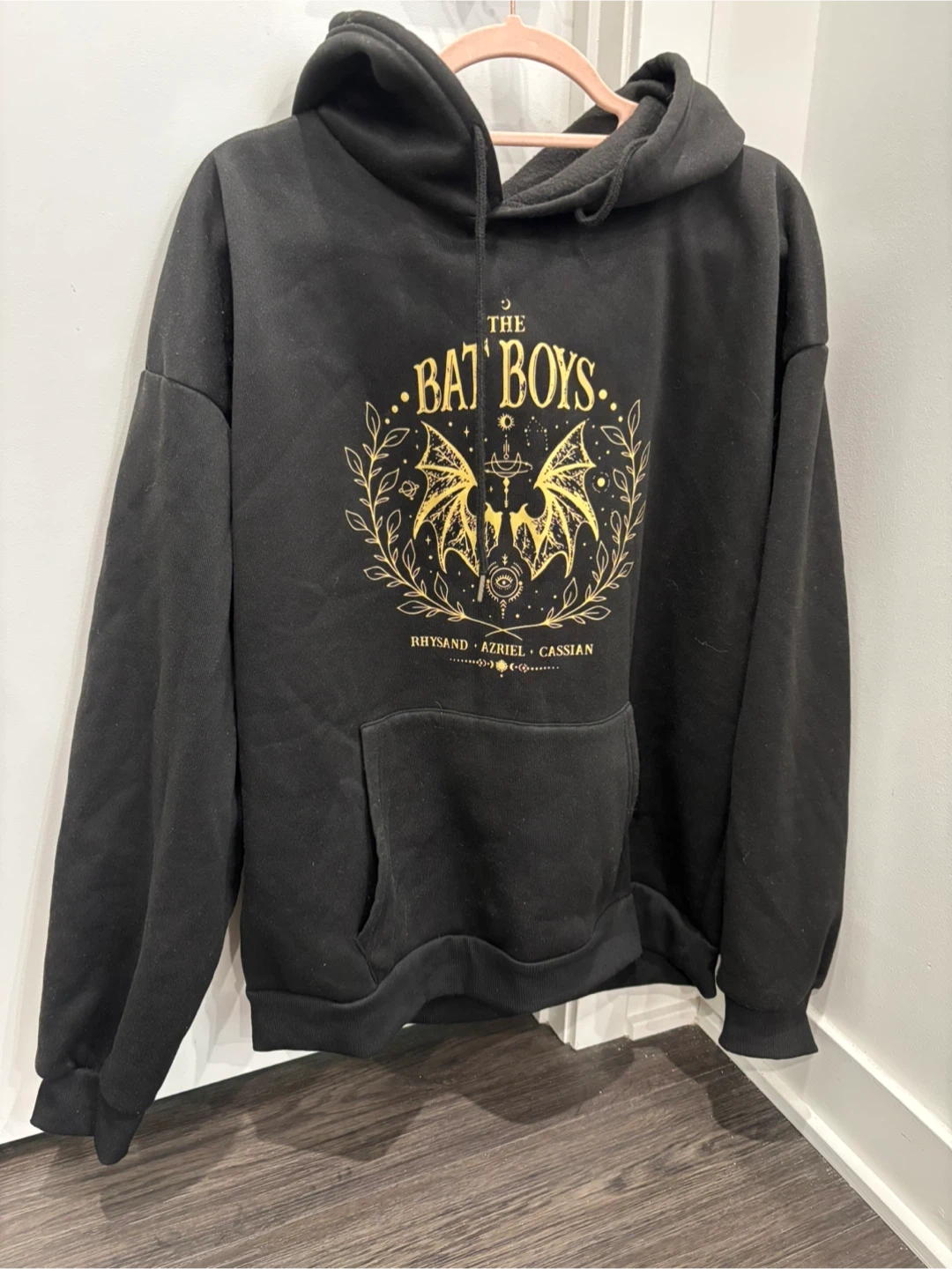 Black hoodie with "The Bat Boys" graphic and wings design. Features Rhysand, Azriel, and Cassian on the front and back. It's a cozy sweatshirt for fans of the series! Size Large