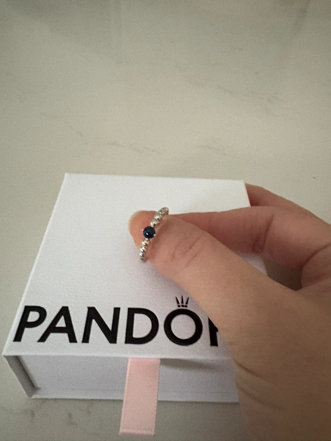 This is a silver Pandora ring, a stylish piece featuring a unique beaded design and a striking dark blue stone.