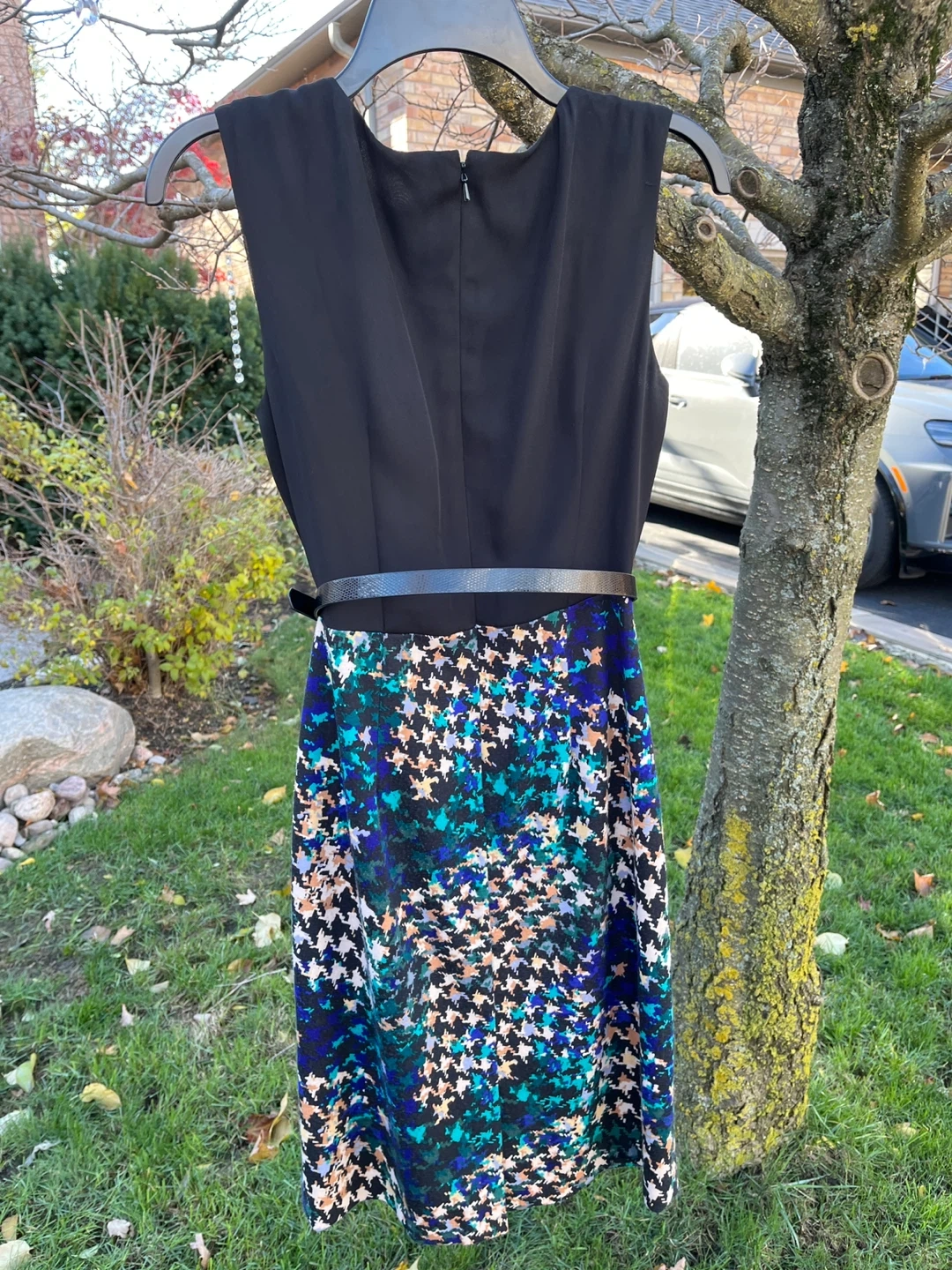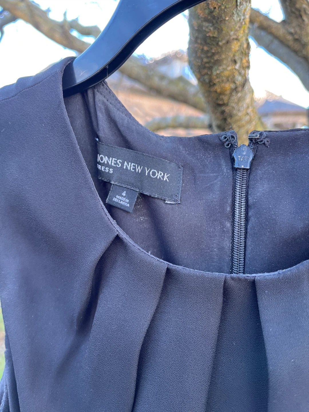 Jones New York dress in size 4. It's a lovely dress with a black top and patterned skirt. Perfect for any occasion!
