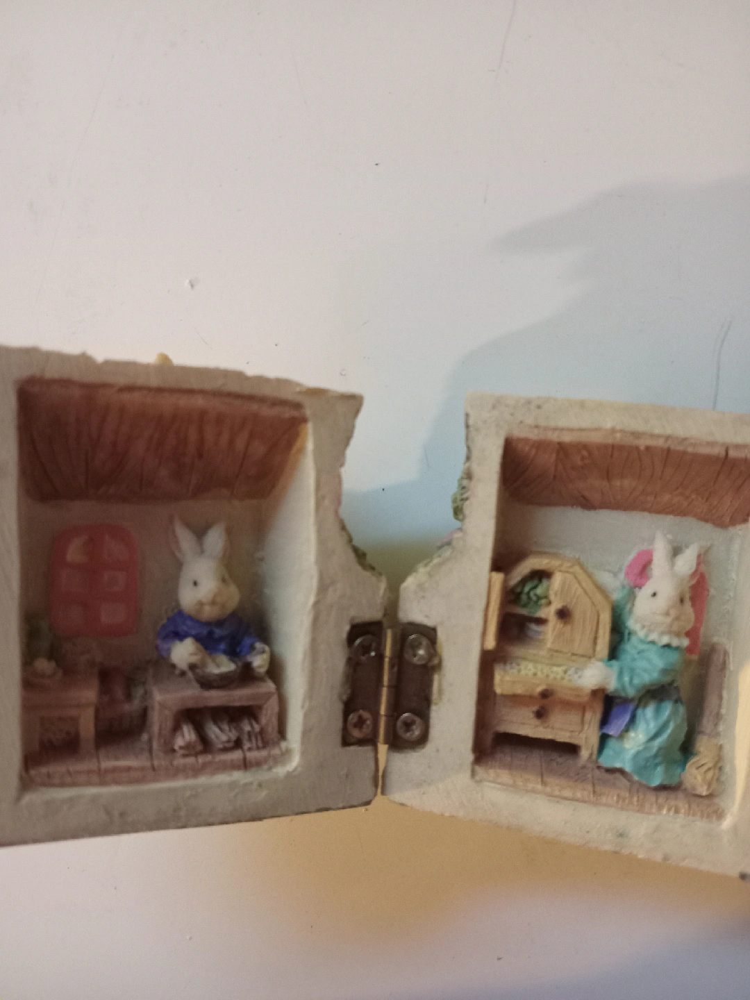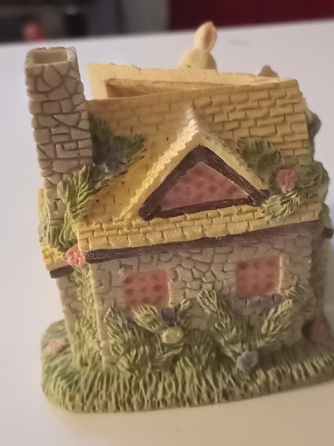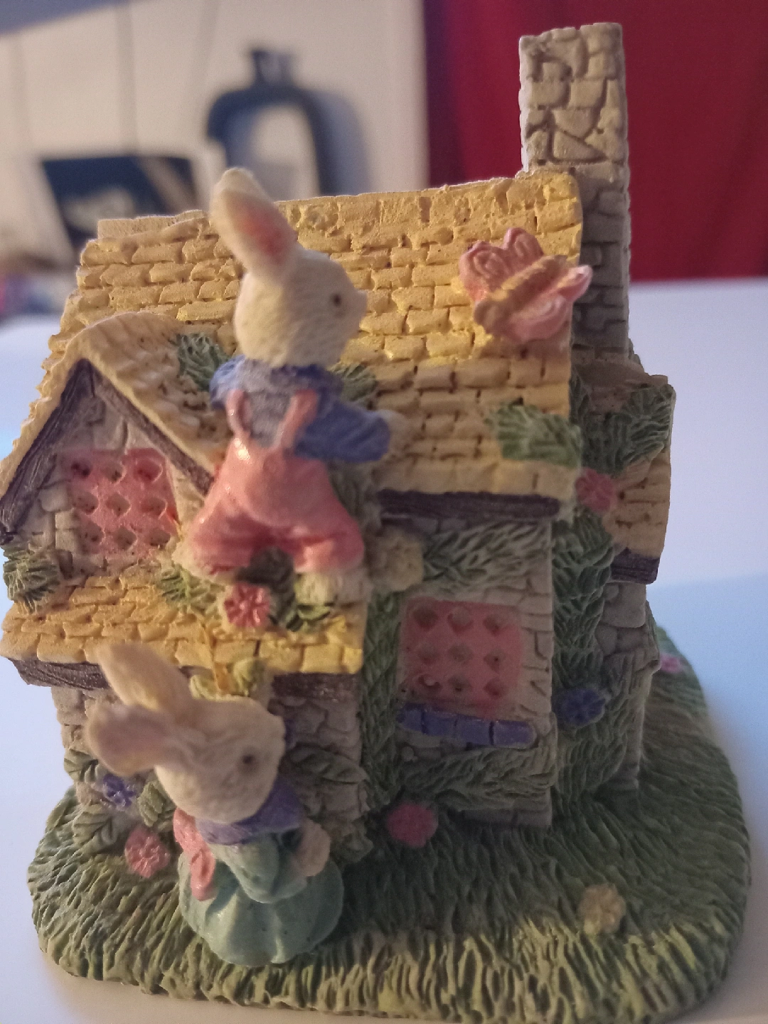 60A charming Enesco bunny house figurine. It features detailed craftsmanship and a whimsical design. Perfect for collectors or as a decorative piece to add a touch of cuteness to any room!