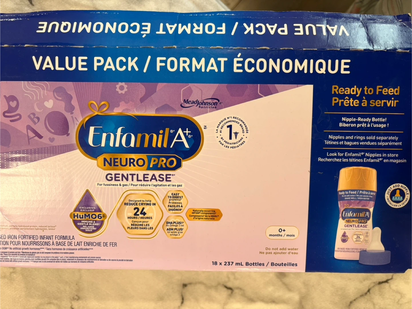 15Selling a value pack of Enfamil A+ NeuroPro Gentlease ready-to-feed bottles! This formula is designed for fussiness and gas, and is easy to digest. The pack contains 10 bottles, each 237 mL. Perfect for newborns 0+ months. Ready to feed, so no water needed!