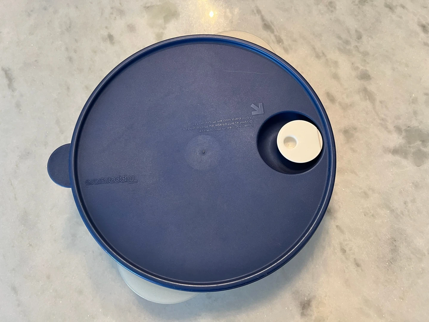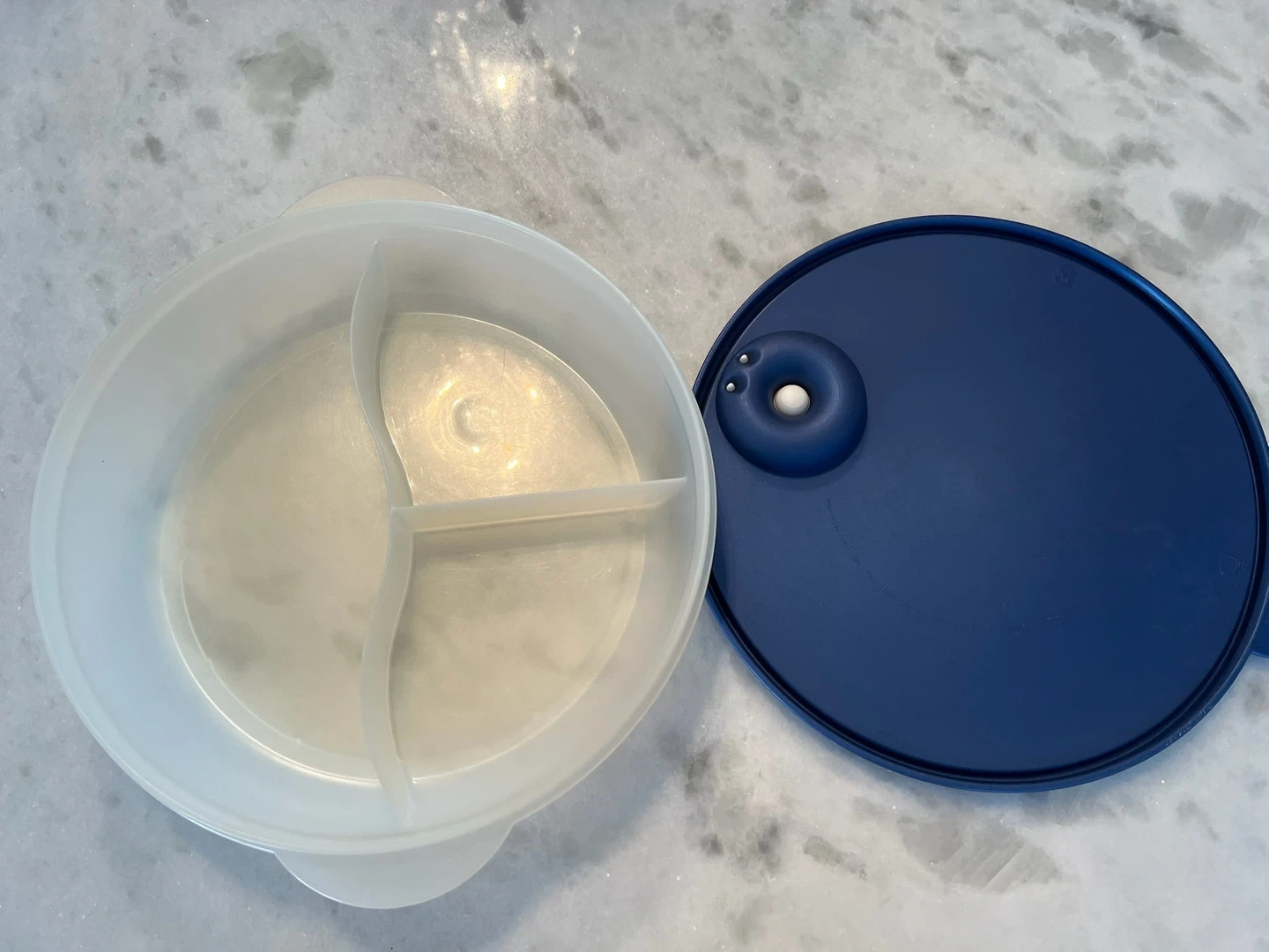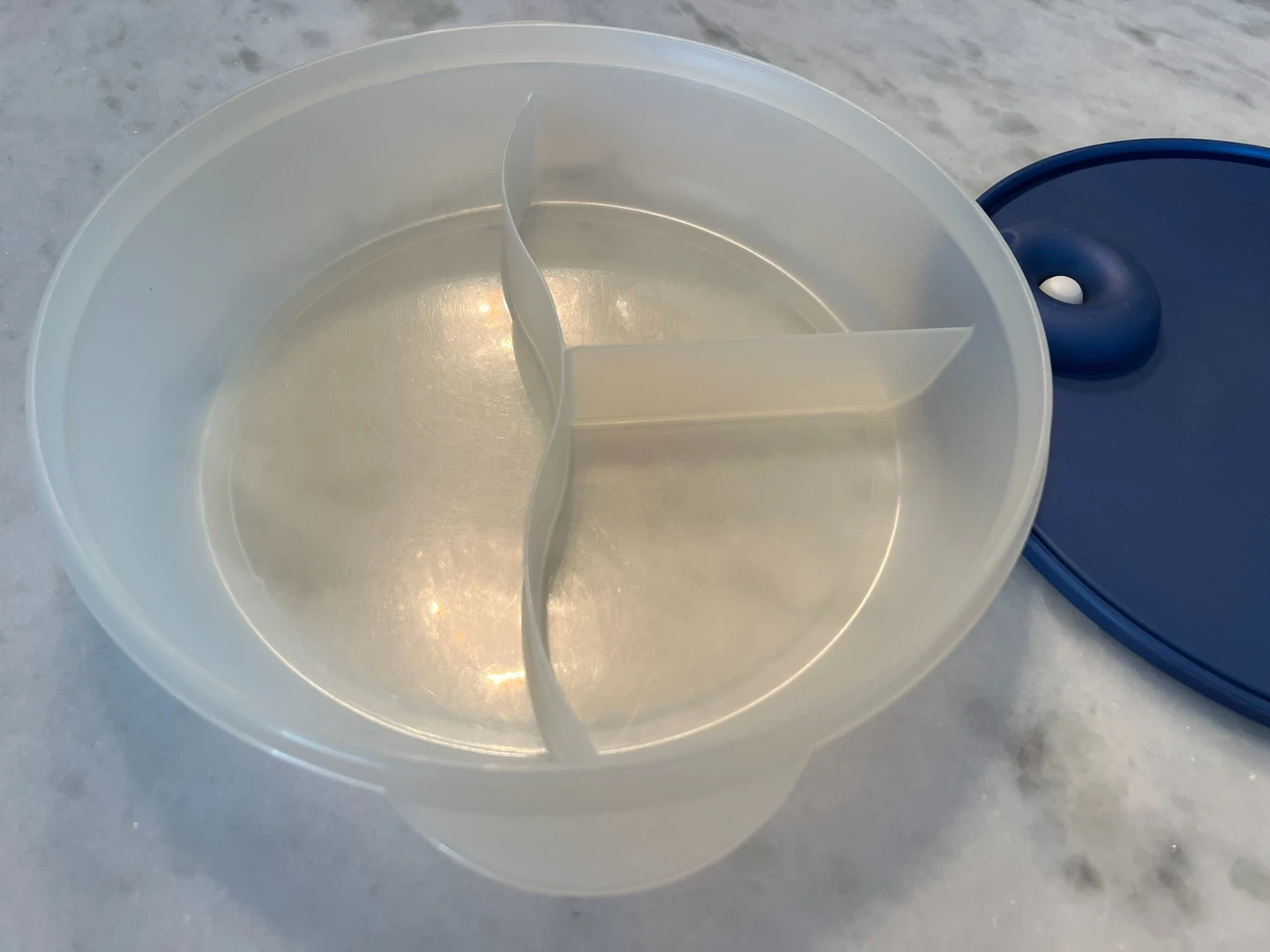 This is a vintage Tupperware divided serving dish with a navy blue lid. It has three compartments for serving different foods. Perfect for snacks or sides!